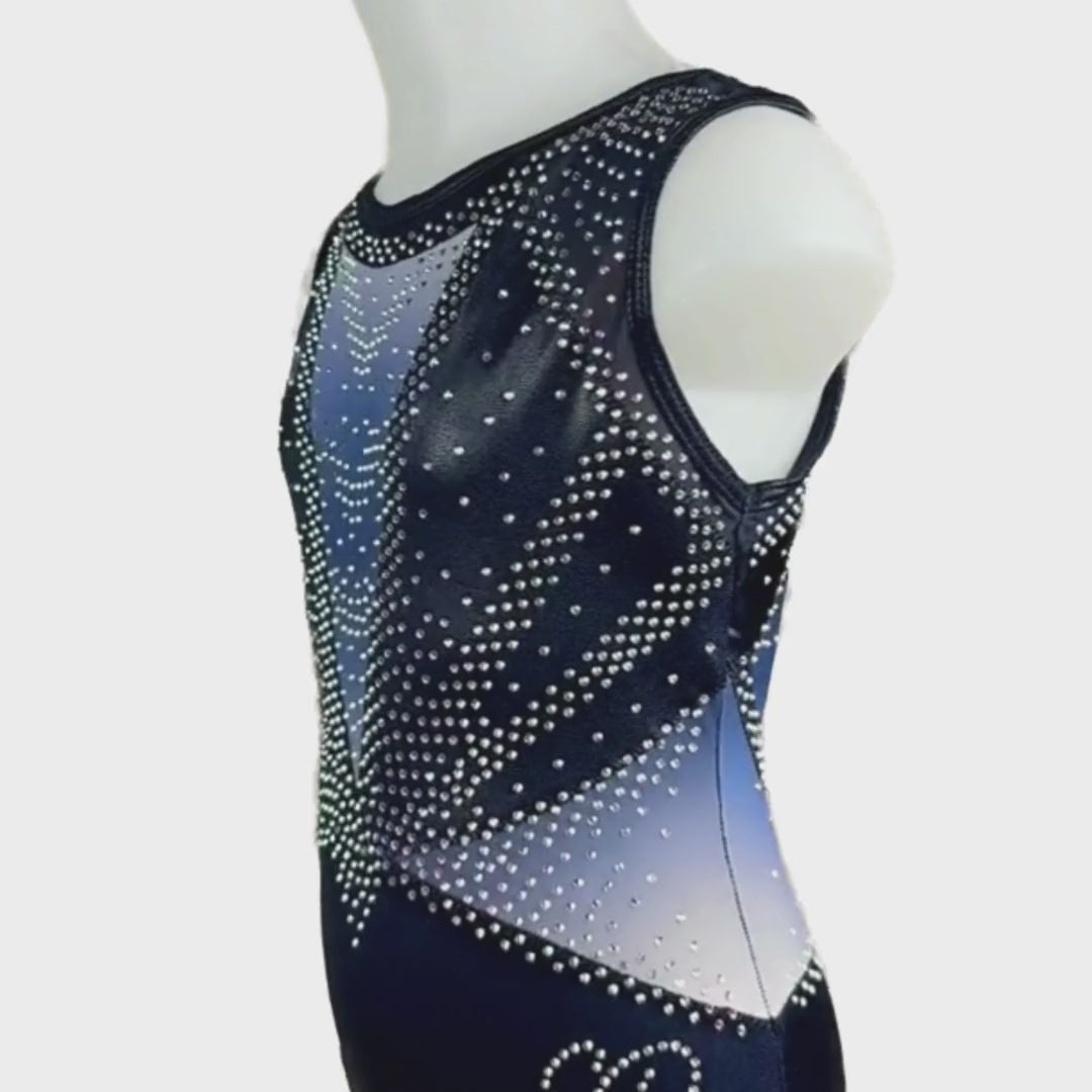 De turnpakjes uit onze Luxury Collectie staan online! Meer steentjes, meer luxe en unieke ontwerpen voor een scherpe prijs. Het turnpakje is gemaakt van mystic glitter stof in de kleur navy blauw. De rest van het turnpakje is gemaakt van gaas met een kleurverloop van navy blauw naar wit ombre. De vele luxe crystal steentjes zijn in de kleur AB en kleuren mee als je beweegt. De perfecte eyecatcher om stralend voor de dag te komen tijdens de wedstrijden, maar ook ideaal te dragen tijdens een training.