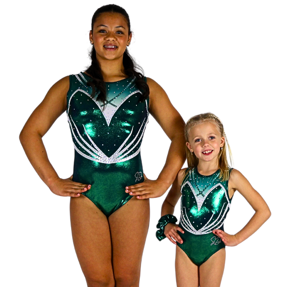 Dit exclusieve lekker zittende turnpakje Bibi is gemaakt van mystic glitter stof en is er nu ook in de kleuren groen met wit. De rest van het turnpakje is gemaakt van gaas met een kleurverloop van groen naar wit ombre. Het lijfje is voorzien van een nude kleurige onderlaag waardoor het turnpakje niet doorschijnt. De crystal steentjes zijn in de kleur AB en kleuren mee als je beweegt. Perfecte eyecatcher om stralend voor de dag te komen tijdens de wedstrijden, maar ook ideaal te dragen tijdens een training.