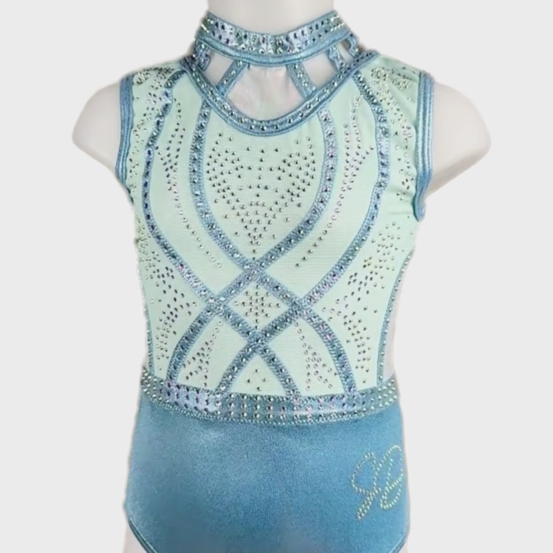 Dit exclusieve mouwloze turnpakje Elsa is gemaakt van mystic en gaas en heeft onder het gaas een glitter mystic laagje in de kleuren lichtblauw en zilver wat een prachtig effect geeft. De crystal steentjes zijn in de kleur A/B en kleuren mee als je beweegt. De achterkant en voorkant zijn speciaal en voorzien van een mooi patroon en bijzondere details. Door de korte mouwen ideaal om mee te trainen, maar ook perfect te dragen als clubpakje door de mooie details en luxe uitstraling.