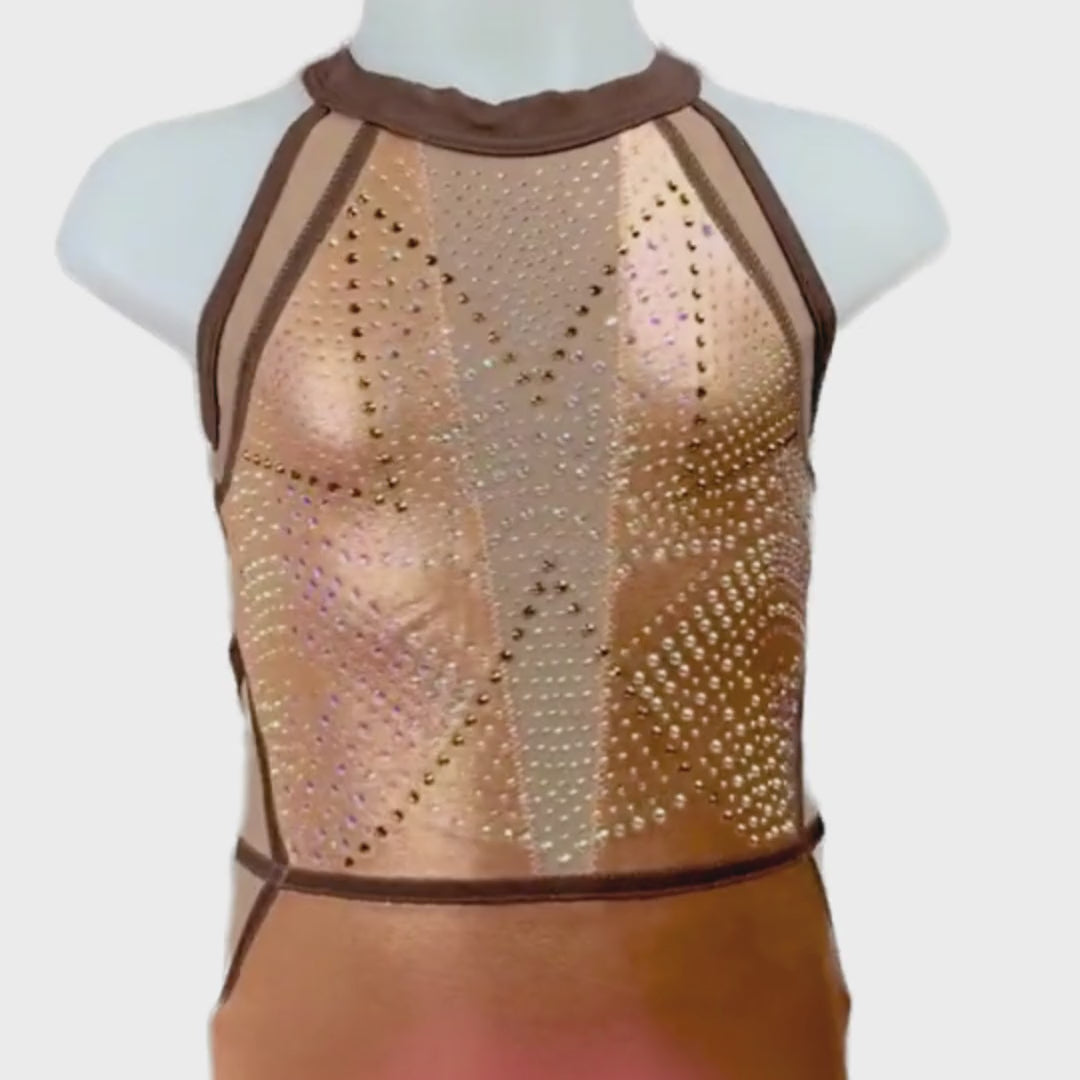 Dit prachtige turnpakje Aurelia is van het merk Believe uit Engeland. Dit turnpakje is gemaakt van mystic in de kleur champagne goud met details in het bruin. De crystal steentjes zijn in de kleur A/B, bruin en champagne en kleuren mee als je beweegt. De achterkant en voorkant zijn speciaal en voorzien van een mooi patroon en bijzondere details.