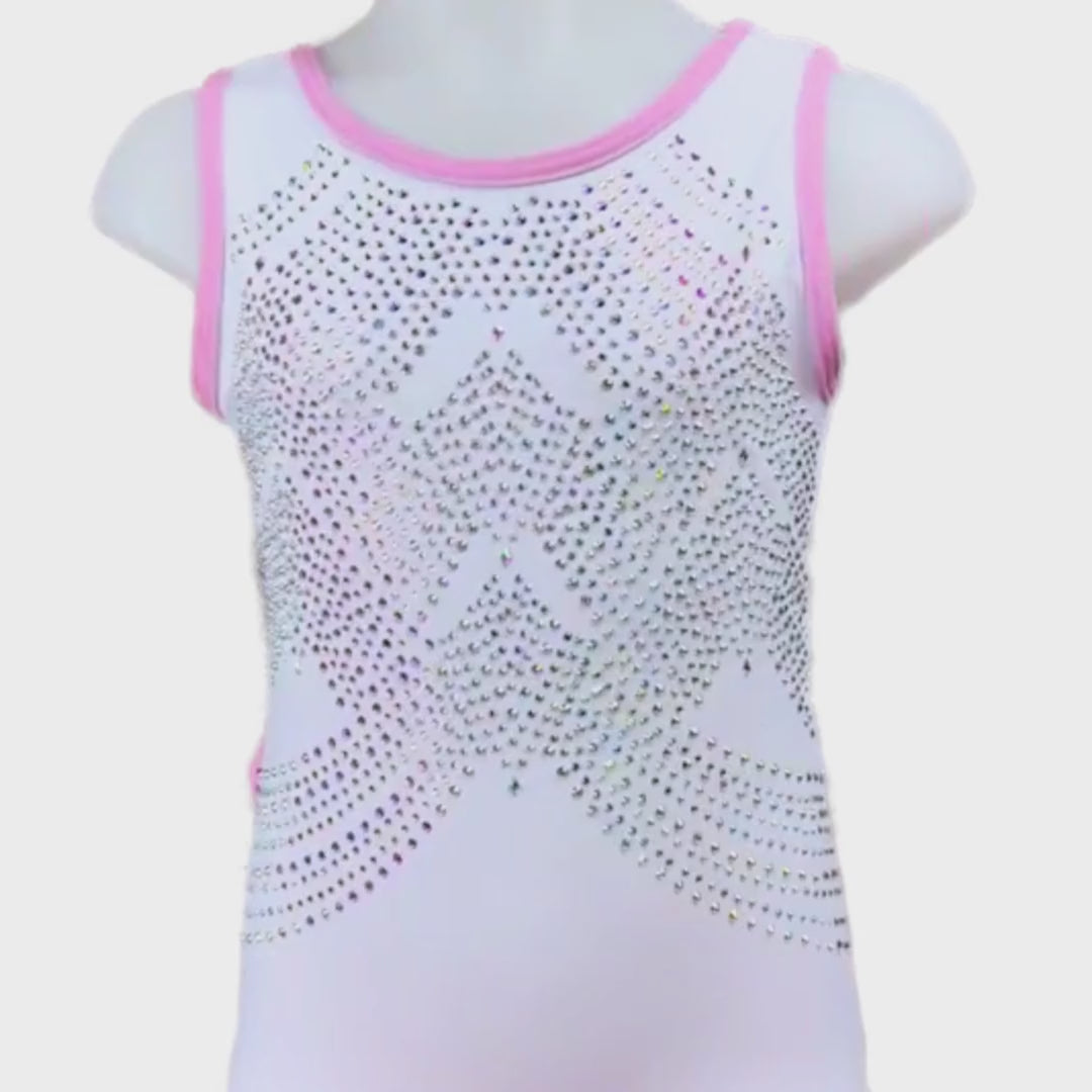 Dit prachtige turnpakje Gigi is van het merk Believe uit Engeland. Dit turnpakje is gemaakt van lycra in de kleur wit met details in lichtroze lycra. De crystal steentjes zijn in de kleur A/B en kleuren mee als je beweegt. De achterkant en voorkant zijn speciaal en voorzien van een mooi patroon en bijzondere details.