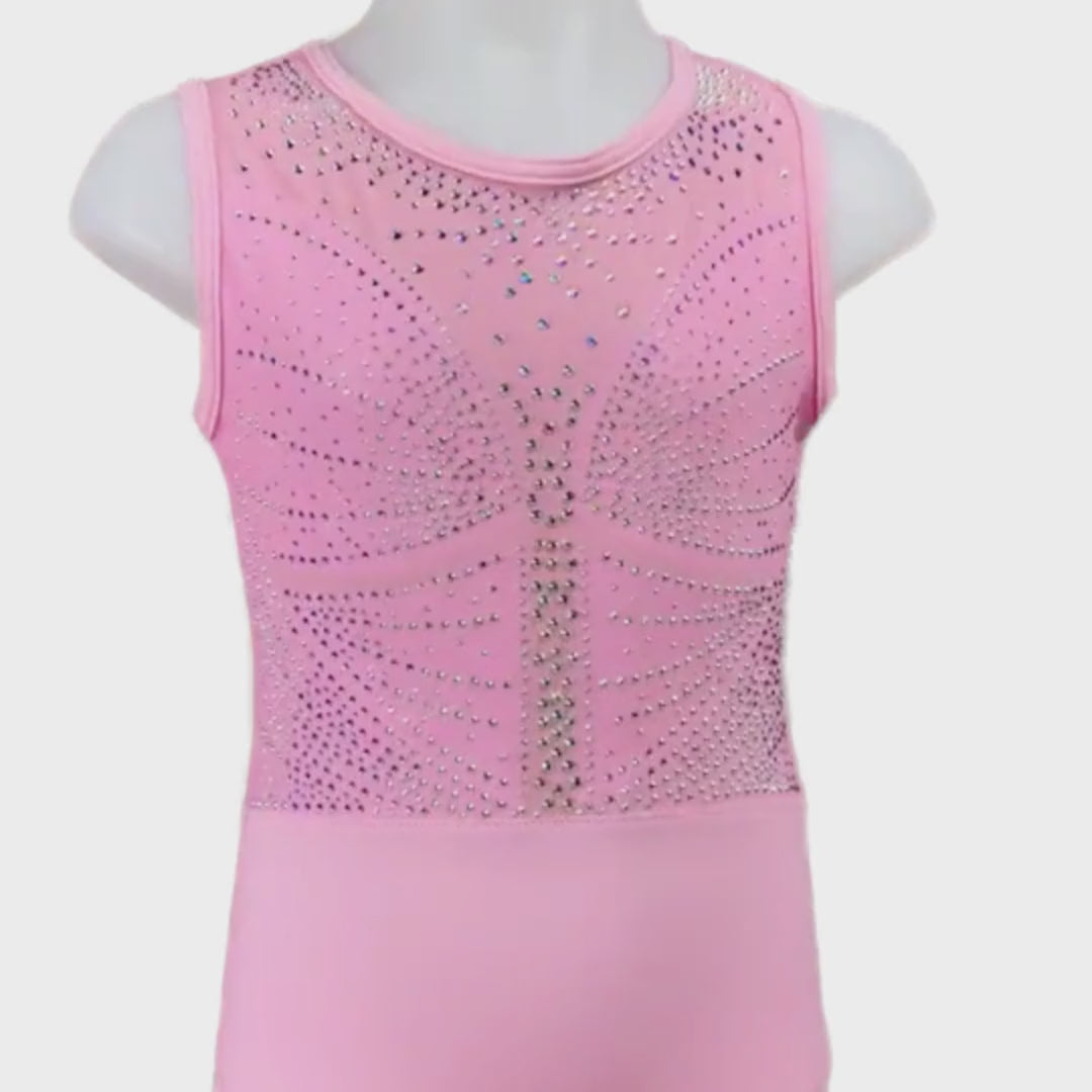 Dit prachtige turnpakje Monroe is van het merk Believe uit Engeland. Dit turnpakje is gemaakt van babyroze dubbel gevoerd lycra. De crystal steentjes zijn in de kleur A/B en kleuren mee als je beweegt. De achterkant en voorkant zijn speciaal en voorzien van een mooi patroon en bijzondere details.