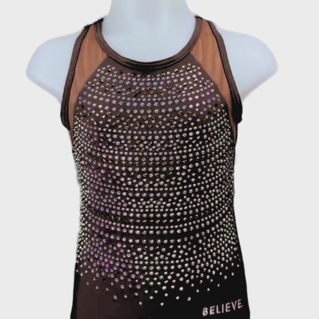 Dit prachtige turnpakje Odette is van het merk Believe uit Engeland. Dit turnpakje is gemaakt van lycra in de kleur bruin met details in een tint lichter. De crystal steentjes zijn in de kleur A/B en brons en kleuren mee als je beweegt. De achterkant en voorkant zijn speciaal en voorzien van een mooi patroon en bijzondere details.