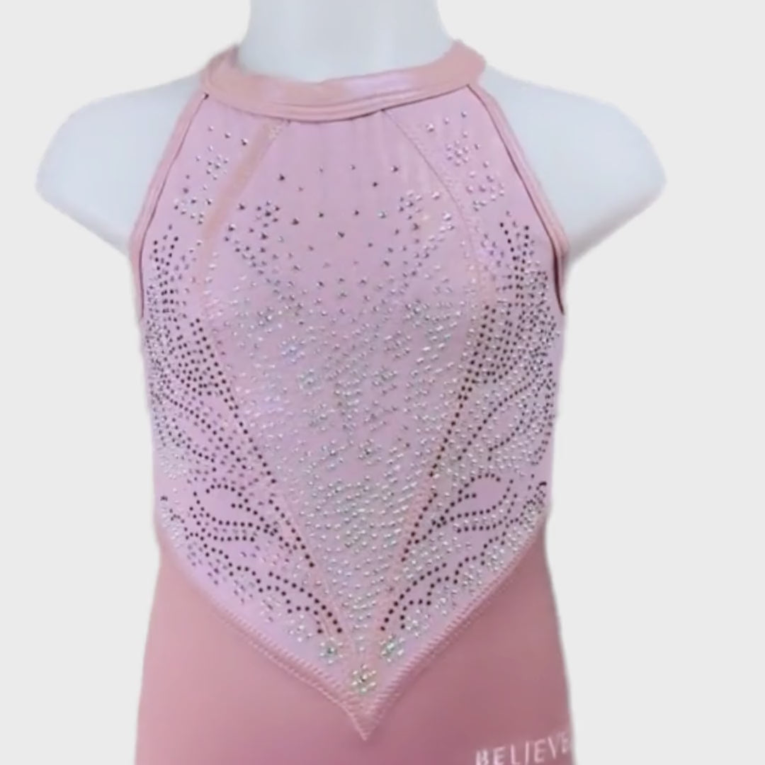 Dit prachtige turnpakje Rose is van het merk Believe uit Engeland. Dit turnpakje is gemaakt van wetlook lycra in de kleur blush en gaas in de kleur lichtroze. De crystal steentjes zijn in de kleur A/B en roze en kleuren mee als je beweegt. De achterkant en voorkant zijn speciaal en voorzien van een mooi patroon en bijzondere details.