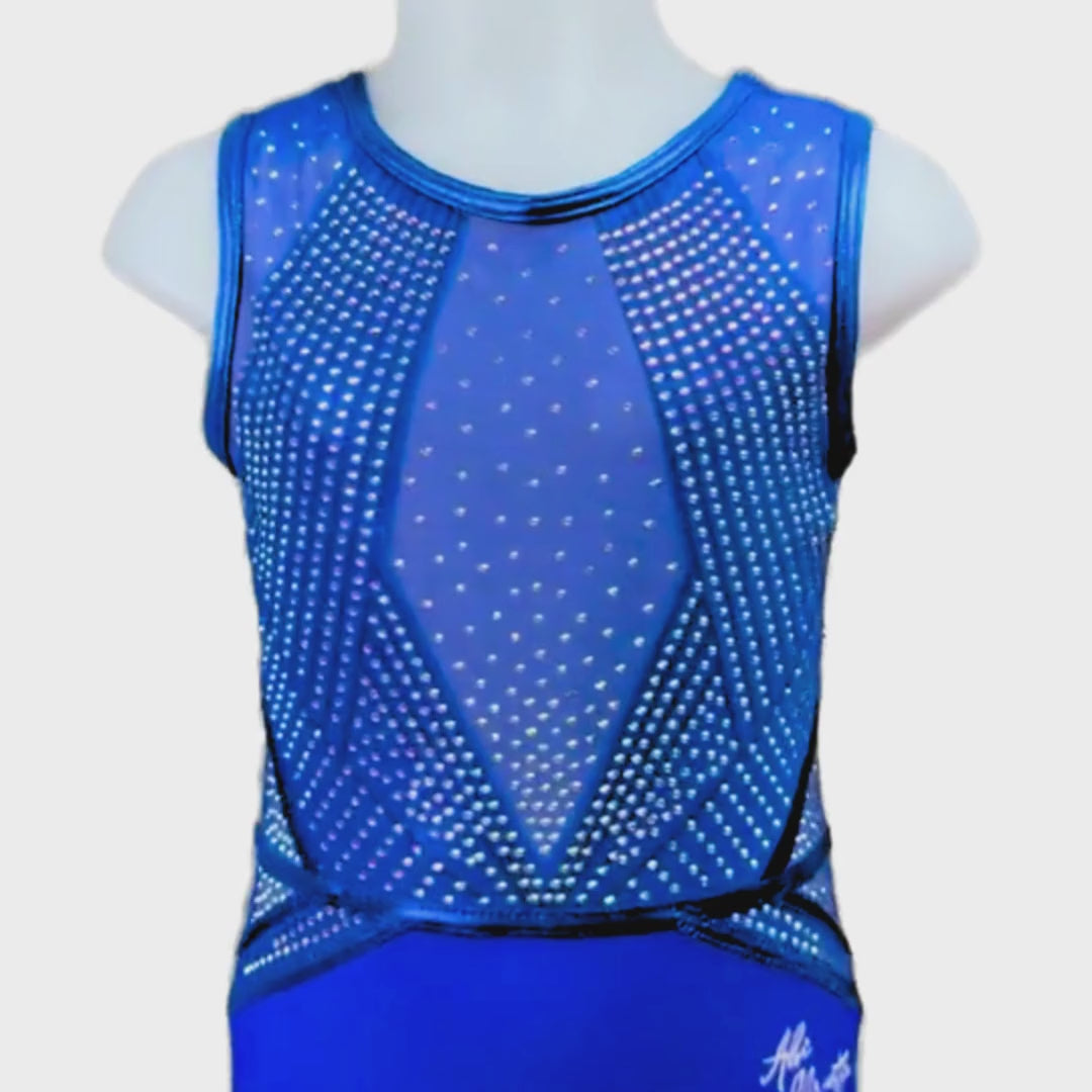 Dit prachtige turnpakje The Blue One is van het merk Believe uit Engeland. Dit turnpakje is gemaakt van royal blauw lycra met mystic blauwe details. De crystal steentjes zijn in de kleur A/B en kleuren mee als je beweegt. De achterkant en voorkant zijn speciaal en voorzien van een mooi patroon en bijzondere details.