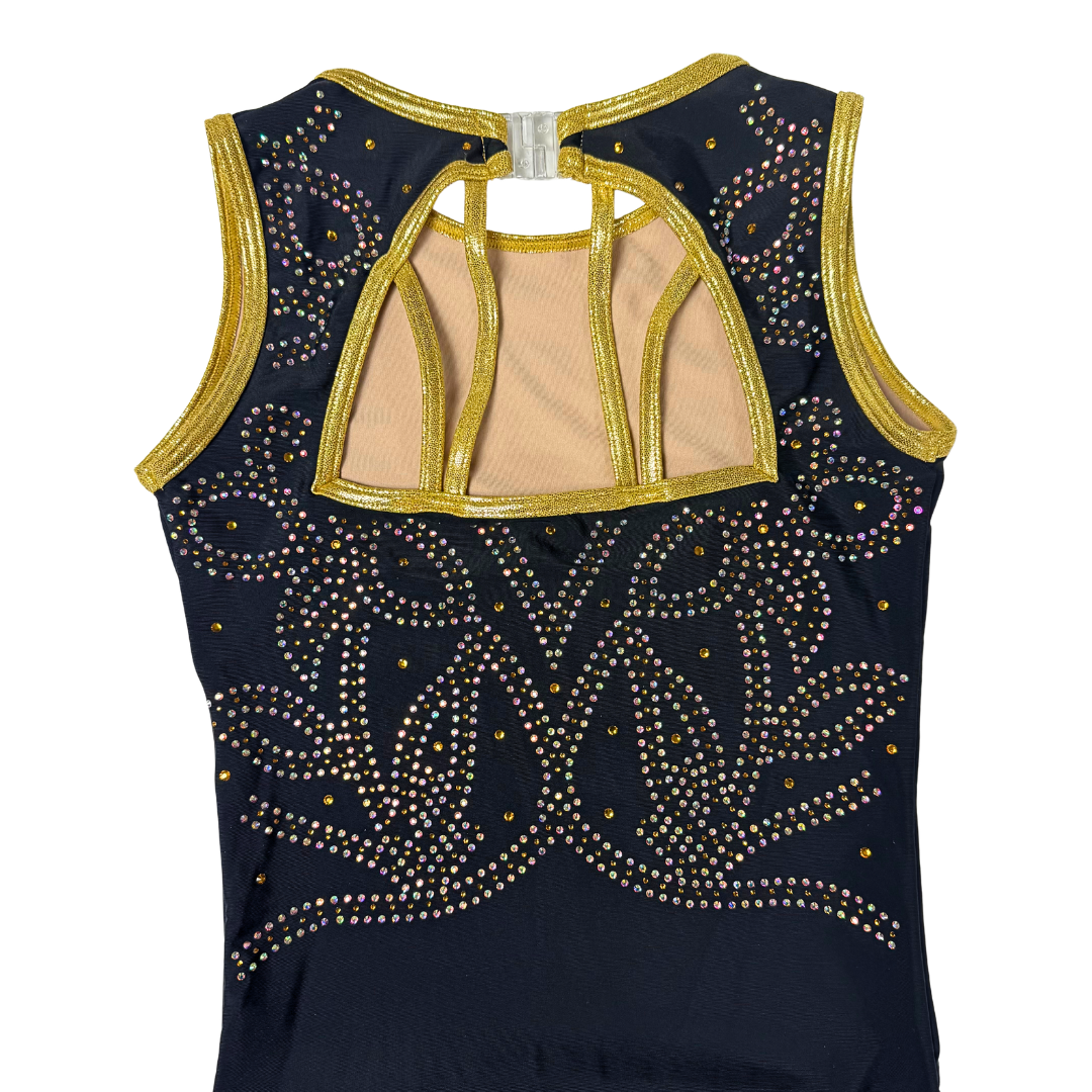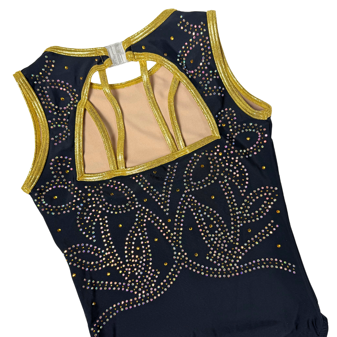 Dit prachtige mouwloze turnpakje Floor Zwart/Goud is gemaakt van dubbel gevoerde lycra en stof met de accentkleur goud in mystic.