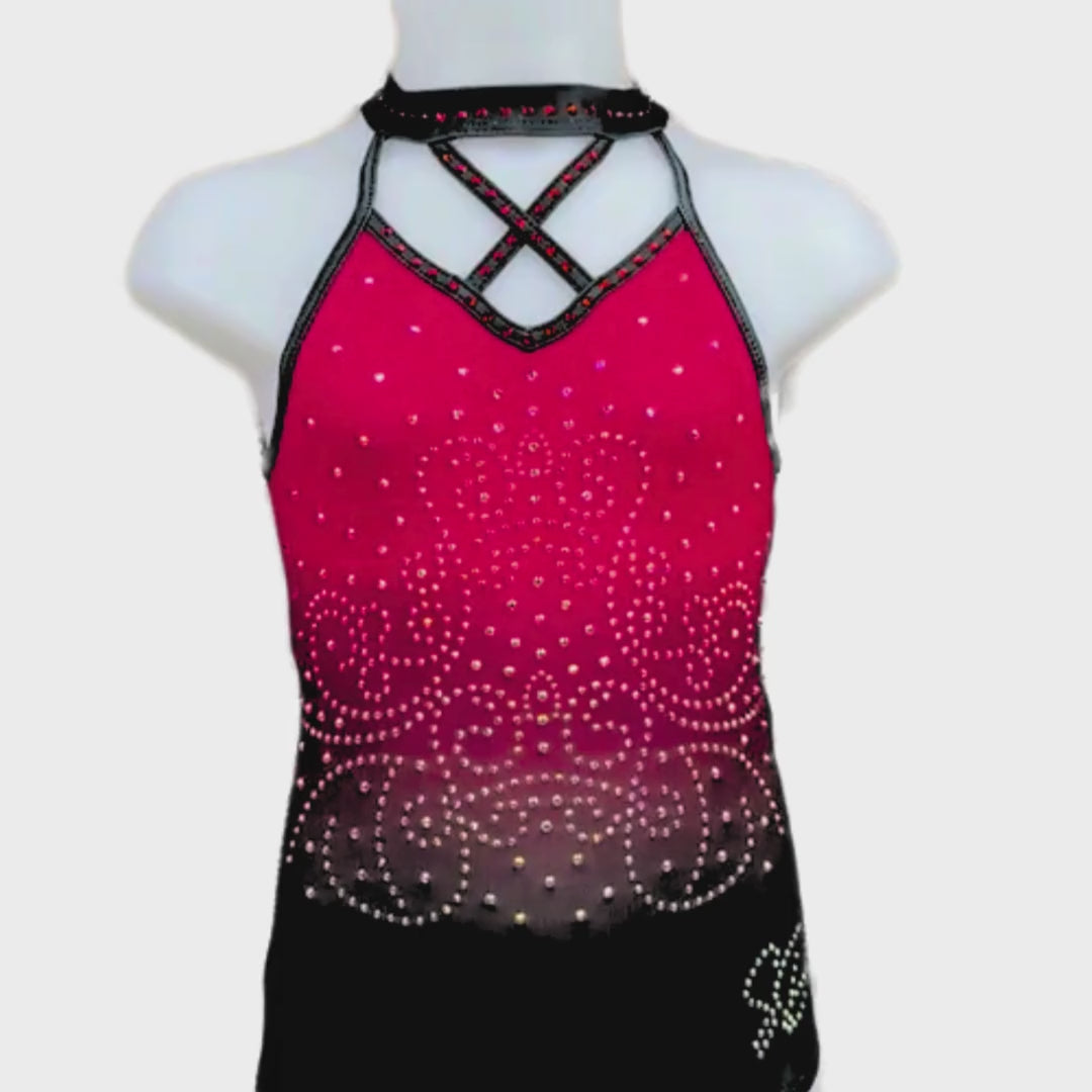 Dit prachtige turnpakje Anna is gemaakt van rood en zwart lycra met een overgang tussen de twee kleuren, wat een luxe effect geeft. De crystal steentjes zijn in de kleur A/B en kleuren mee als je beweegt. De achterkant en voorkant zijn speciaal en voorzien van een mooi patroon en bijzondere details.