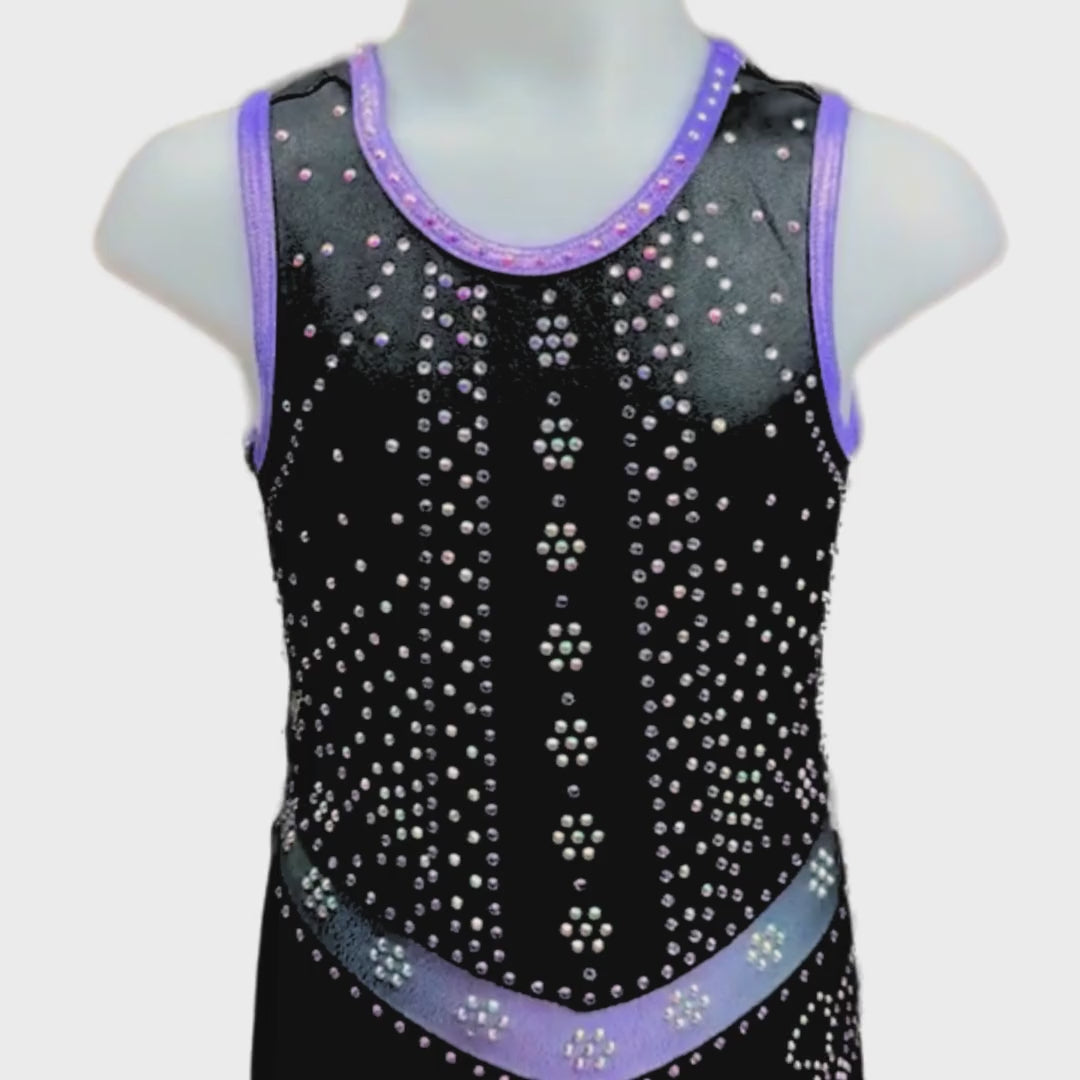Dit exclusieve mouwloze turnpakje Bella is gemaakt van zwart mystic en heeft een holografische band in de kleur lila wat een prachtig effect geeft. De crystal steentjes zijn in de kleur zilver en A/B en kleuren mee als je beweegt. De achterkant en voorkant zijn speciaal en voorzien van een mooi patroon en bijzondere details. Het turnpakje heeft een subtiele gekruiste open rug. Doordat het turnpakje mouwloos is, is het ideaal om mee te trainen, maar ook perfect te dragen als clubpakje door de mooie details en luxe uitstraling.