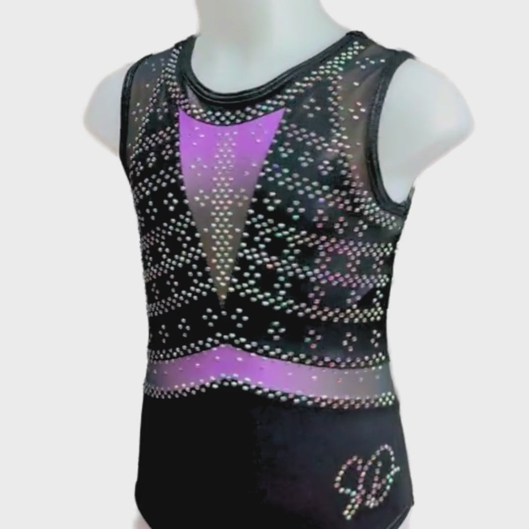 De turnpakjes uit onze Luxury Collectie staan online! Meer steentjes, meer luxe en unieke ontwerpen voor een scherpe prijs. Het turnpakje is gemaakt van mystic glitter stof in de kleuren zwart en lila. De rest van het turnpakje is gemaakt van gaas met een kleurverloop van zwart naar lila ombre. De vele luxe crystal steentjes zijn in de kleur AB en kleuren mee als je beweegt. De perfecte eyecatcher om stralend voor de dag te komen tijdens de wedstrijden, maar ook ideaal te dragen tijdens een training.