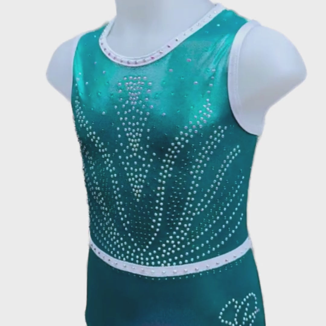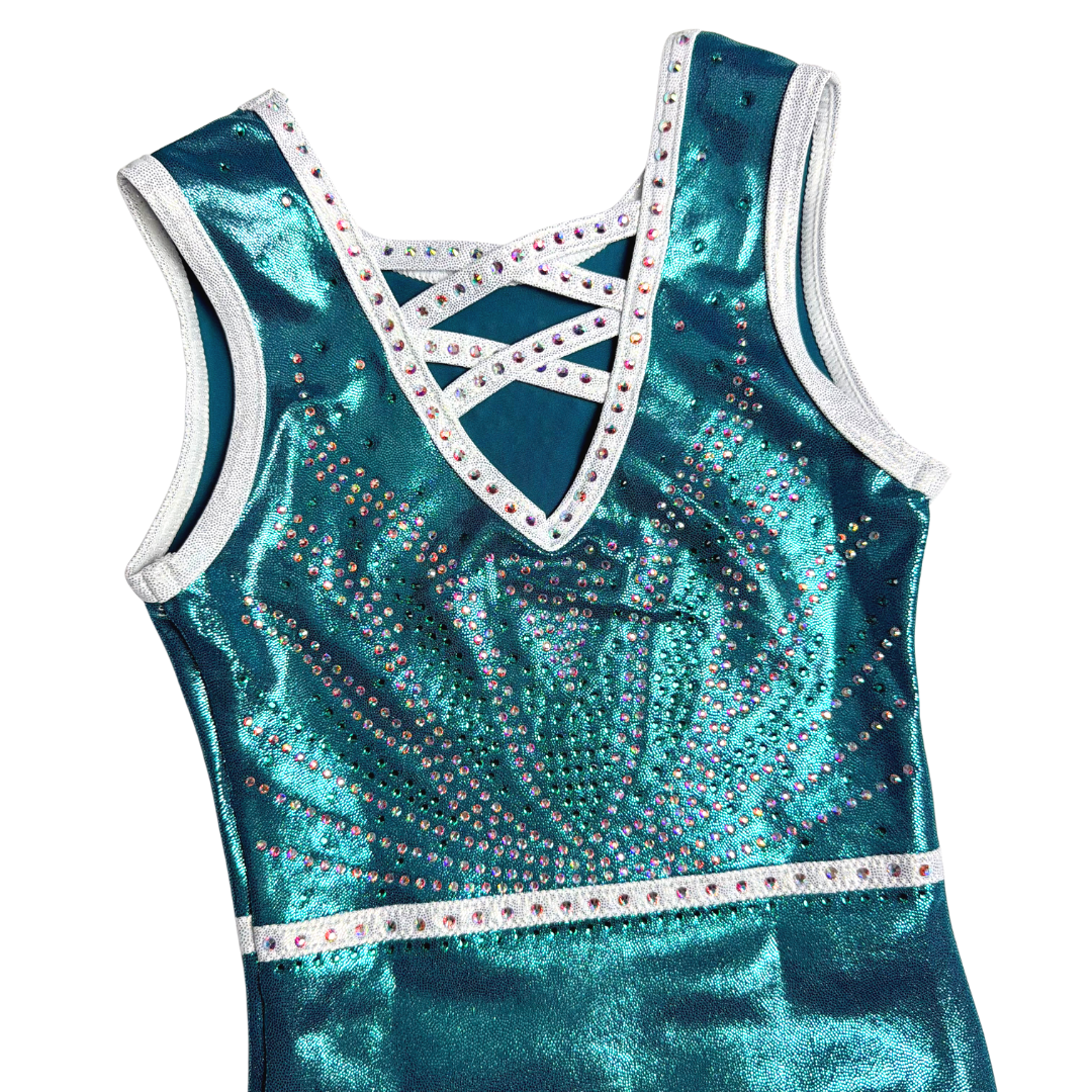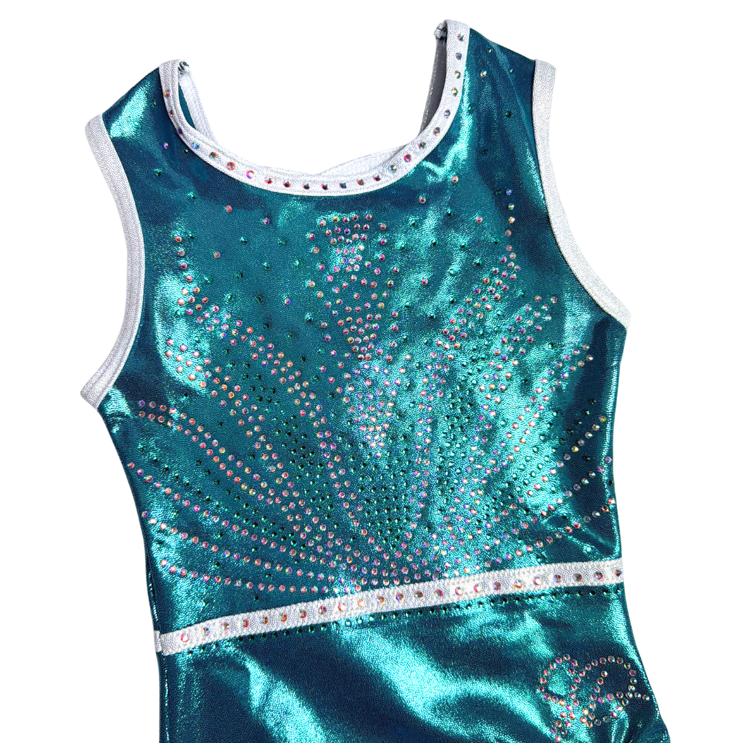 Dit prachtige turnpakje Zenna uit de nieuwste speciale rug collectie is gemaakt van mystic glitter stof in de kleuren zeegroen en zilver/wit. De crystal steentjes zijn in de kleur A/B en turquoise gemixt en kleuren mee als je beweegt. De achterkant is speciaal en voorzien van gekruiste bandjes. Door de korte mouwen ideaal om mee te trainen, maar ook perfect te dragen als wedstrijdpakje door de mooie details en luxe uitstraling.