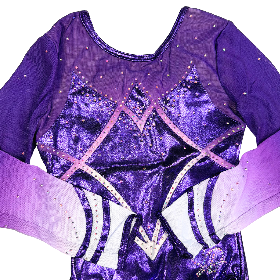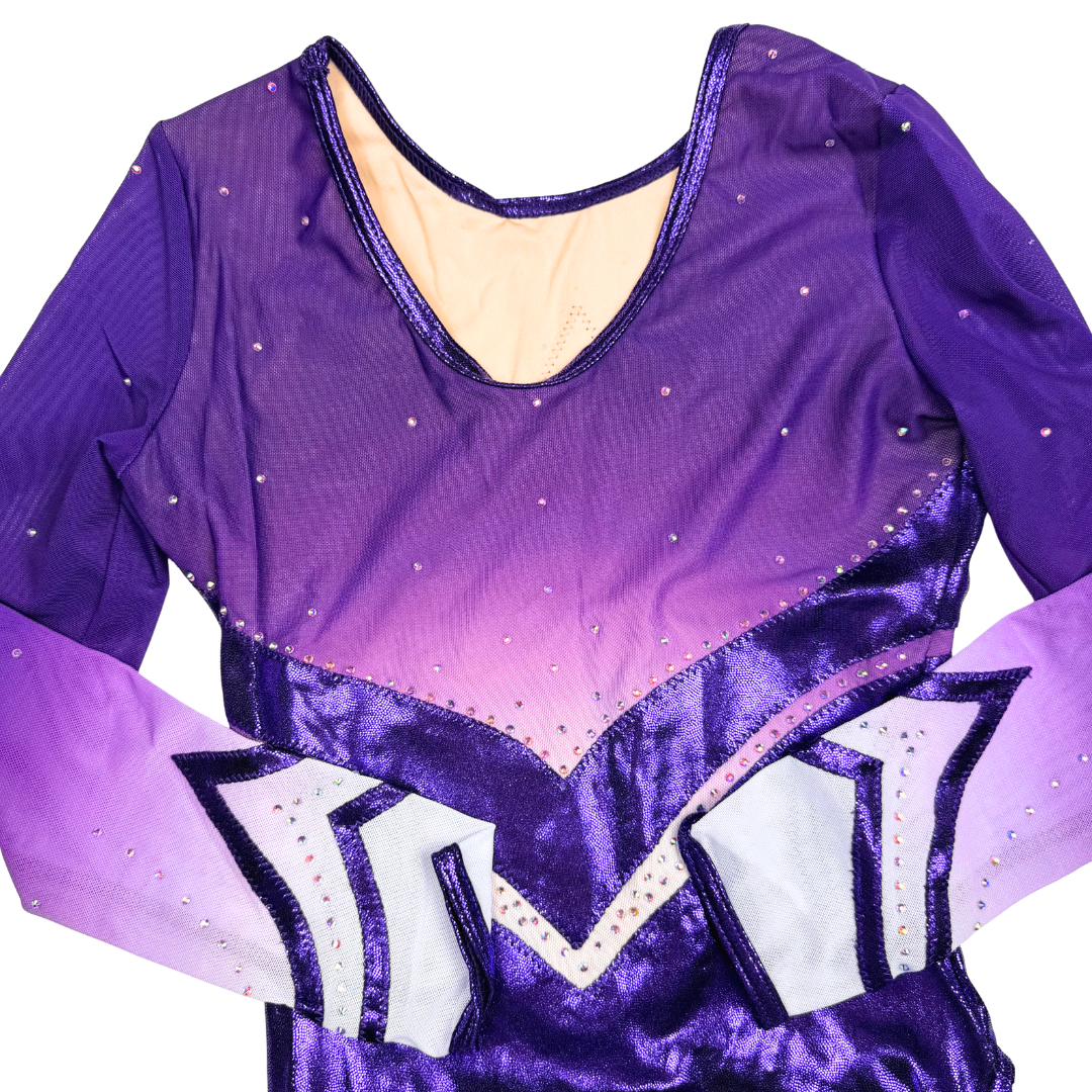 Dit populaire turnpakje Noa met lange mouw is nu ook in het paars toegevoegd aan onze collectie. Het turnpakje is gemaakt van paars mystic glitter stof met een kleur verloop van paars naar wit ombre in het gaas. Het gaas is gevoerd op het lijfje zodat het pakje niet doorschijnt en de mouwen zijn enkel gaas. De luxe steentjes zijn in de kleur A/B crystal en kleuren mee als je beweegt. Door de lange mouwen en mooie details is Noa een blikvanger voor de wedstrijden, maar ook perfect te dragen tijdens een training.