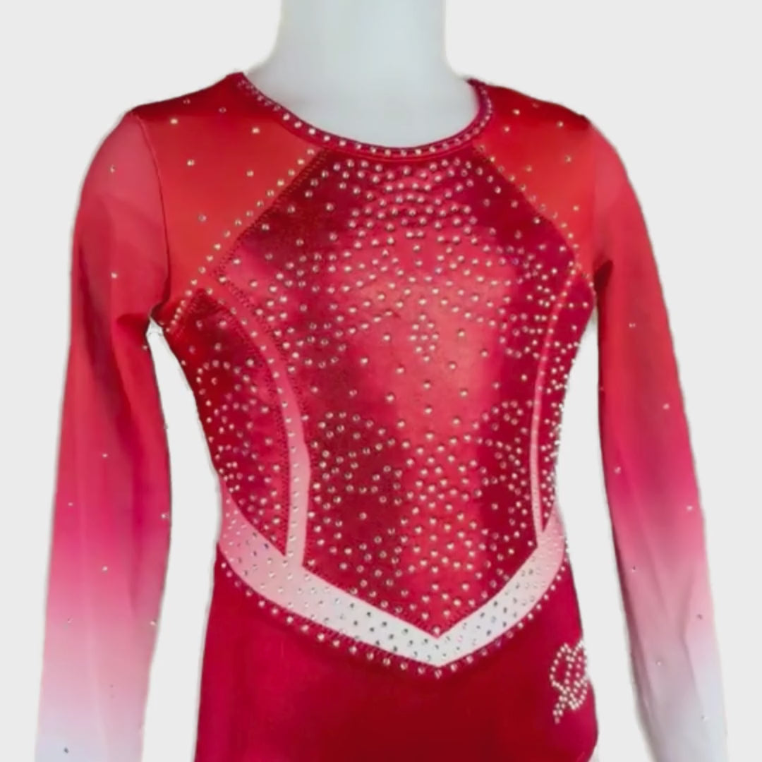 Dit exclusieve lekker zittende turnpakje Quinty met lange mouw is gemaakt van mystic glitter stof in de kleur rood. De mouwen en rest van het turnpakje zijn gemaakt van gaas in de kleur rood met een overgang naar wit. De crystal steentjes zijn in de kleur AB en kleuren mee als je beweegt. Perfecte eyecatcher om stralend voor de dag te komen tijdens de wedstrijden, maar ook ideaal te dragen tijdens een training.