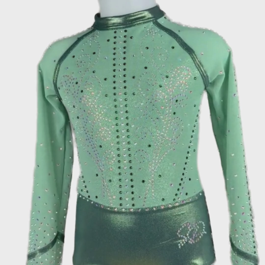 Dit exclusieve turnpakje Tara is onze nieuwste aanwinst in de collectie. Het turnpakje is gemaakt van kaki mystic. De crystal steentjes in een prachtige vorm, zijn in de kleur A/B en kaki en kleuren mee. De achterkant is speciaal en voorzien van een mooi patroon met bijzondere rug waar gaas onder zit. Dit model is ideaal als wedstrijdpakje of om in te trainen, maar ook perfect te dragen als clubpakje door de mooie details en luxe uitstraling.