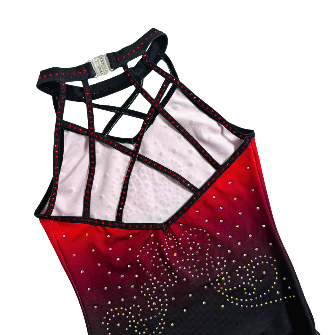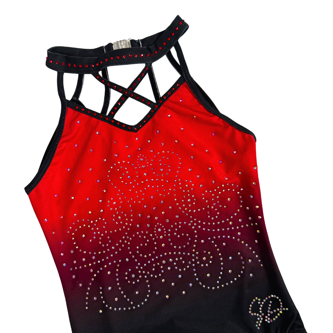Dit prachtige turnpakje Anna is gemaakt van rood en zwart lycra met een overgang tussen de twee kleuren, wat een luxe effect geeft. De crystal steentjes zijn in de kleur A/B en kleuren mee als je beweegt. De achterkant en voorkant zijn speciaal en voorzien van een mooi patroon en bijzondere details.
