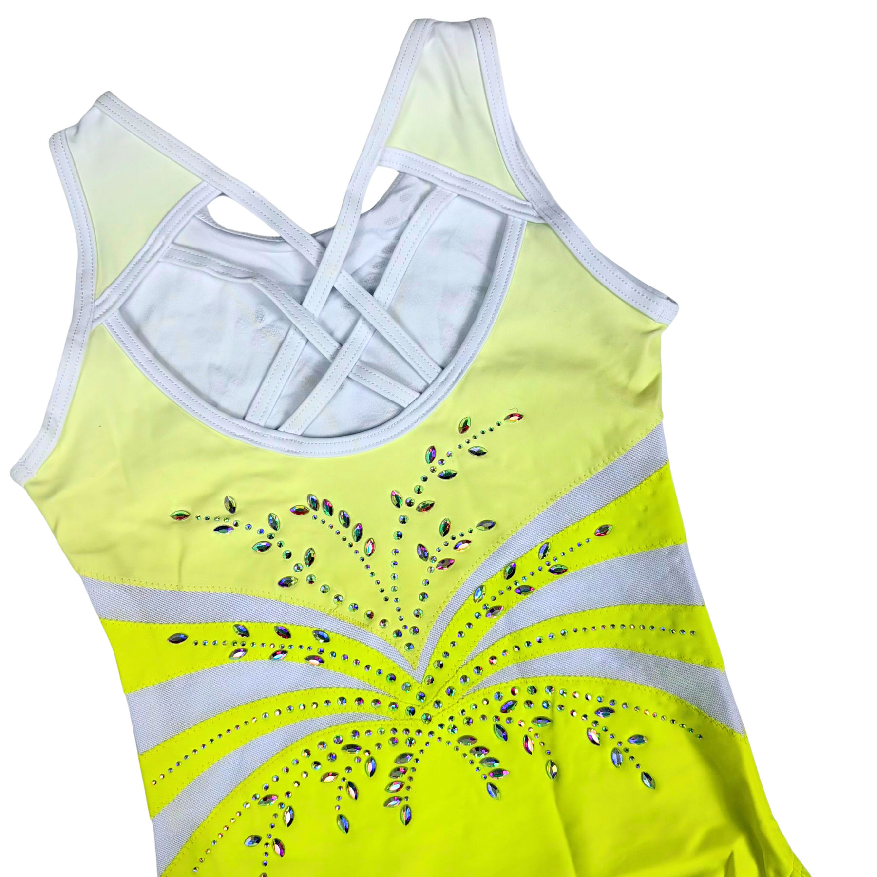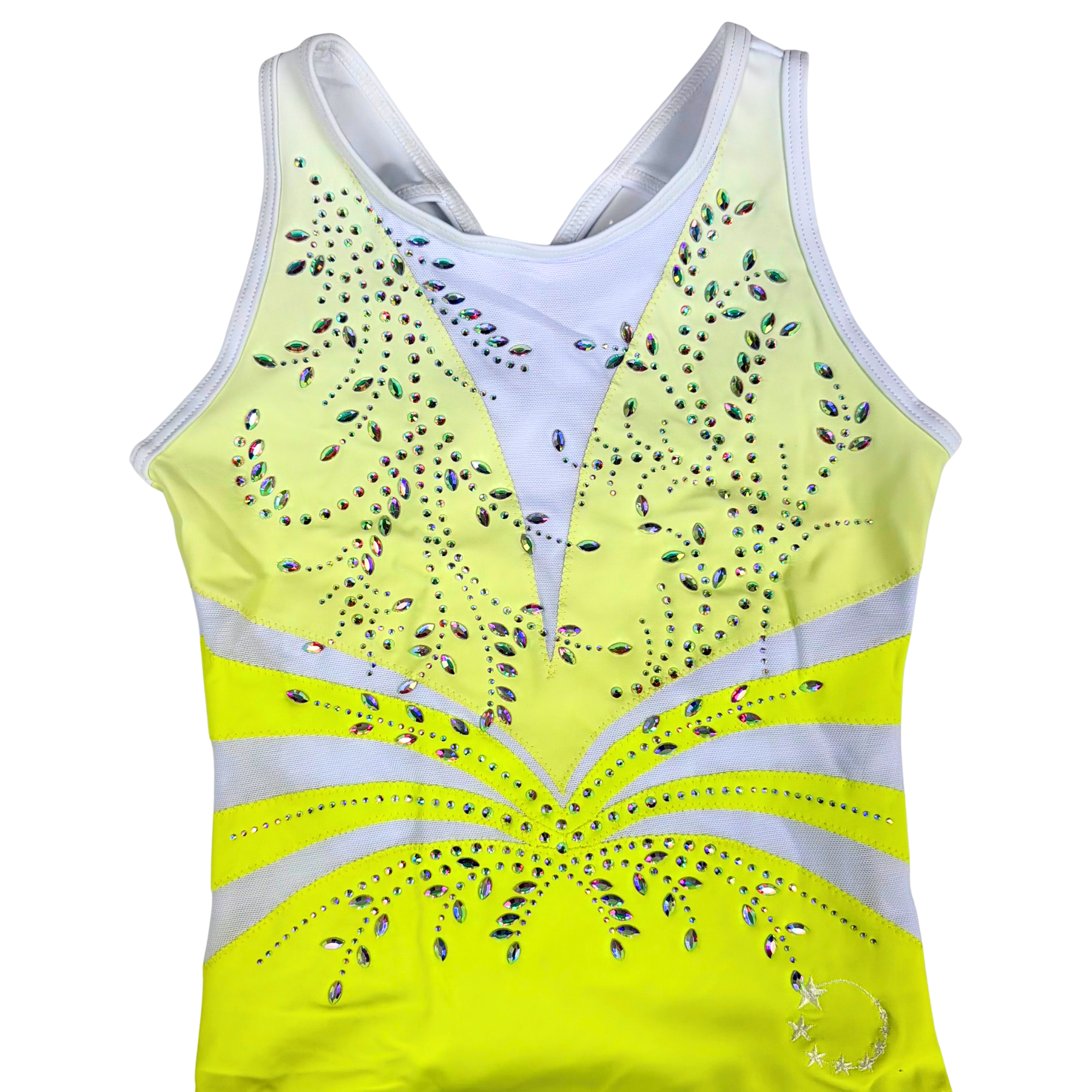 Dit prachtige turnpakje Amalfi is van het merk Little Stars Leotards uit Engeland. Het pakje is gemaakt van gele en witte lycra, met mesh details en schitterende AB steentjes. Zowel de voor- als achterkant zijn speciaal en voorzien van een mooi patroon en bijzondere details.