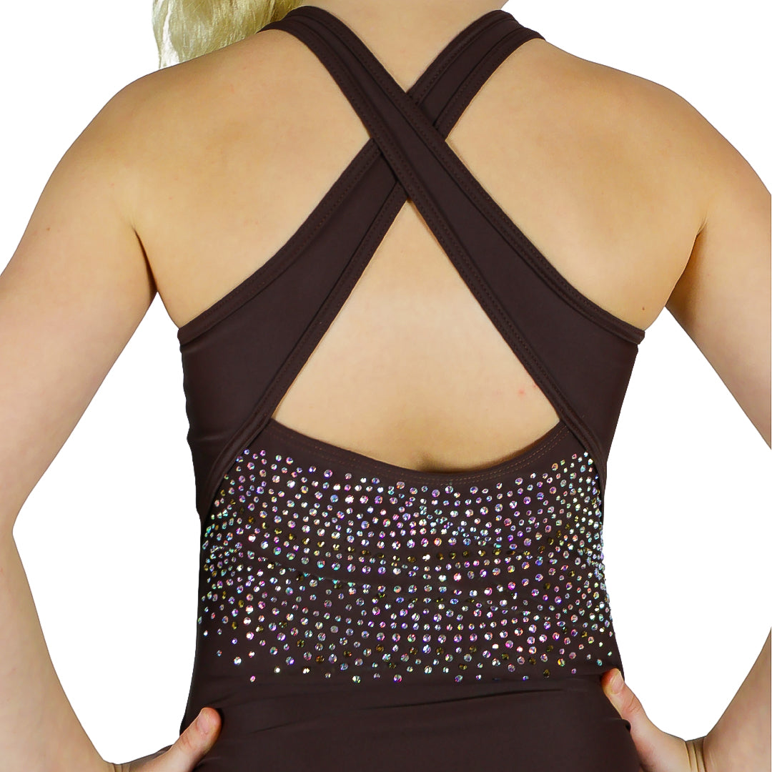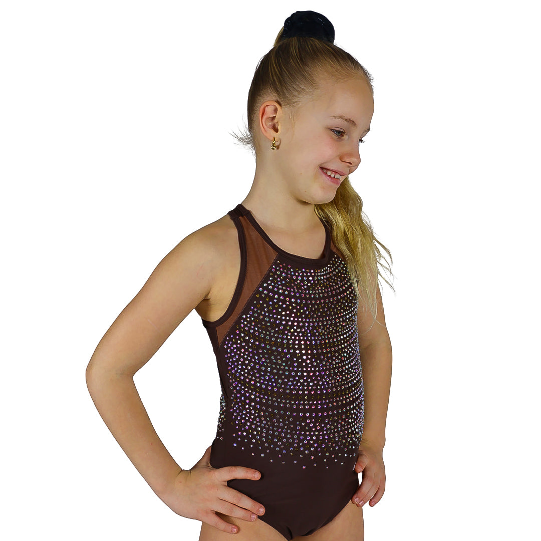 Dit prachtige turnpakje Odette is van het merk Believe uit Engeland. Dit turnpakje is gemaakt van lycra in de kleur bruin met details in een tint lichter. De crystal steentjes zijn in de kleur A/B en brons en kleuren mee als je beweegt. De achterkant en voorkant zijn speciaal en voorzien van een mooi patroon en bijzondere details.