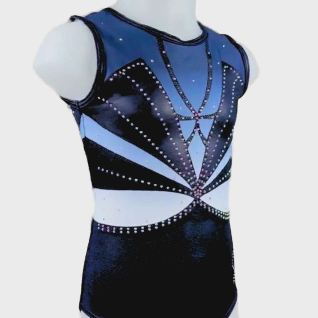 Dit exclusieve lekker zittende mouwloze turnpakje Roos is gemaakt van mystic glitter stof in de kleuren Navy en Wit. Het lycra is van navy blauwe stof met wit naar blauw ombre verloop. De crystal steentjes zijn in de kleur A/B crystal en kleuren mee. Door de luxe uitstraling ideaal voor wedstrijden, maar ook perfect te dragen tijdens een training.