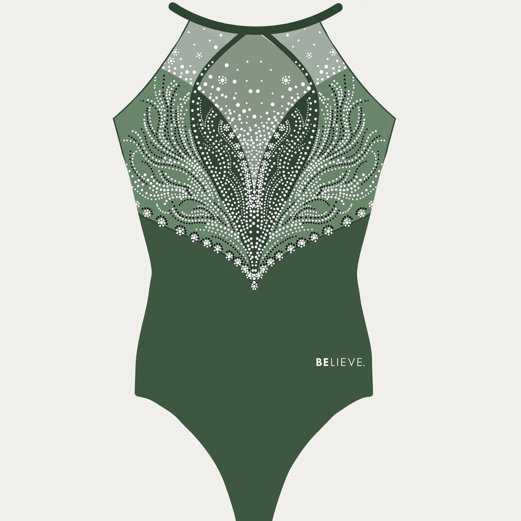 Dit prachtige turnpakje Bell is van het merk Believe uit Engeland. Dit turnpakje is gemaakt van wetlook lycra in de kleur teal en gaas in dezelfde tint. De crystal steentjes zijn in de kleur A/B en teal en kleuren mee als je beweegt. De achterkant en voorkant zijn speciaal en voorzien van een mooi patroon en bijzondere details.