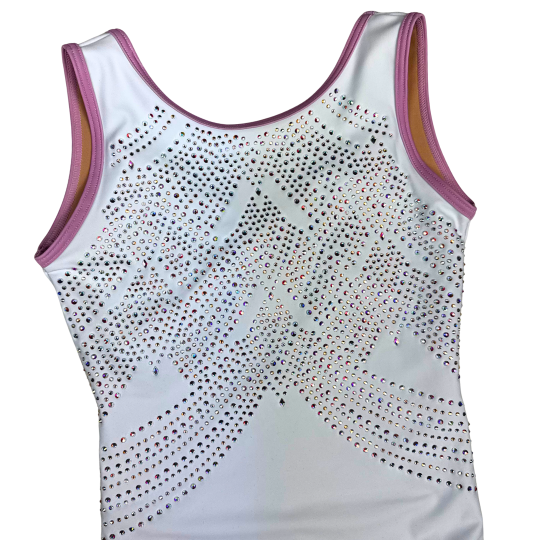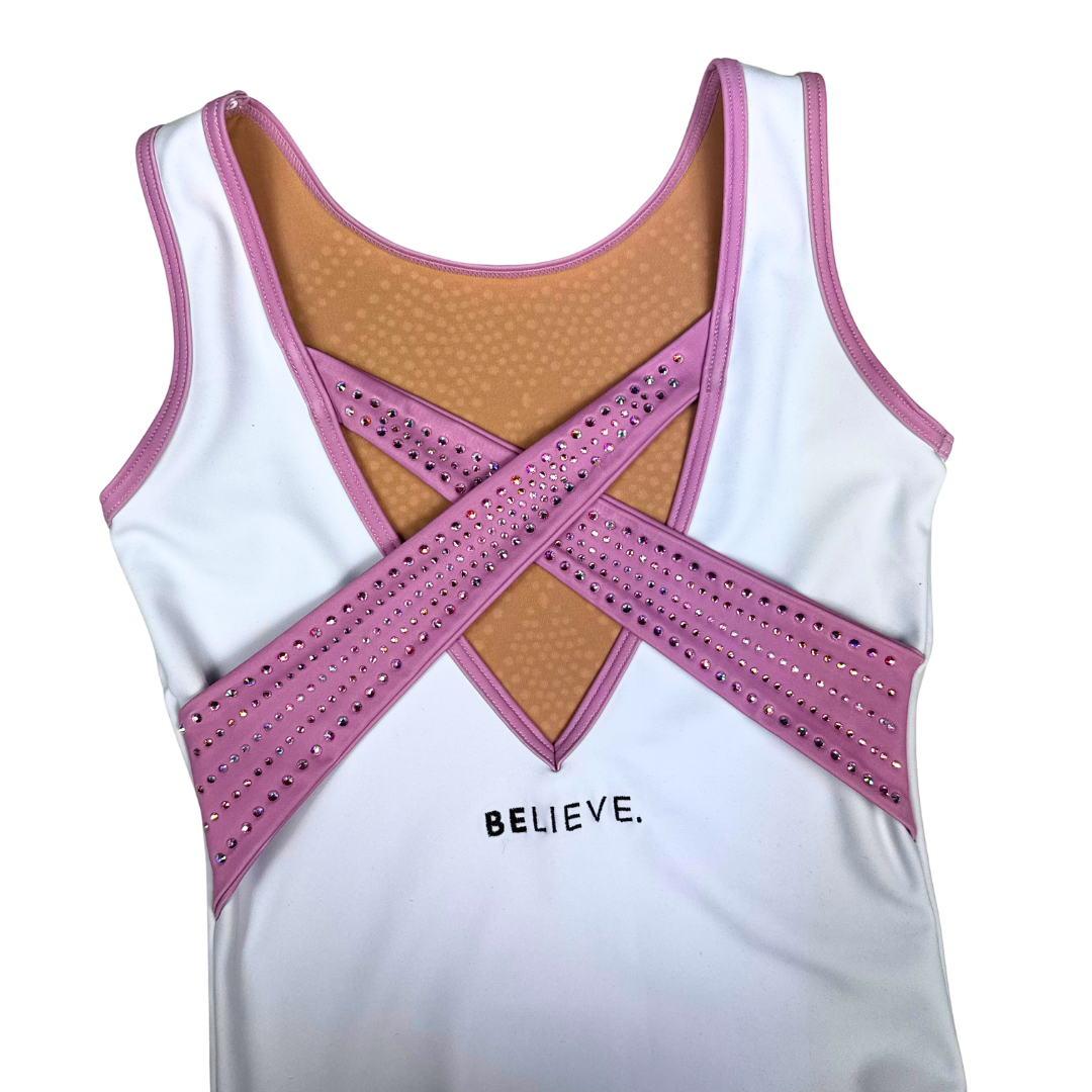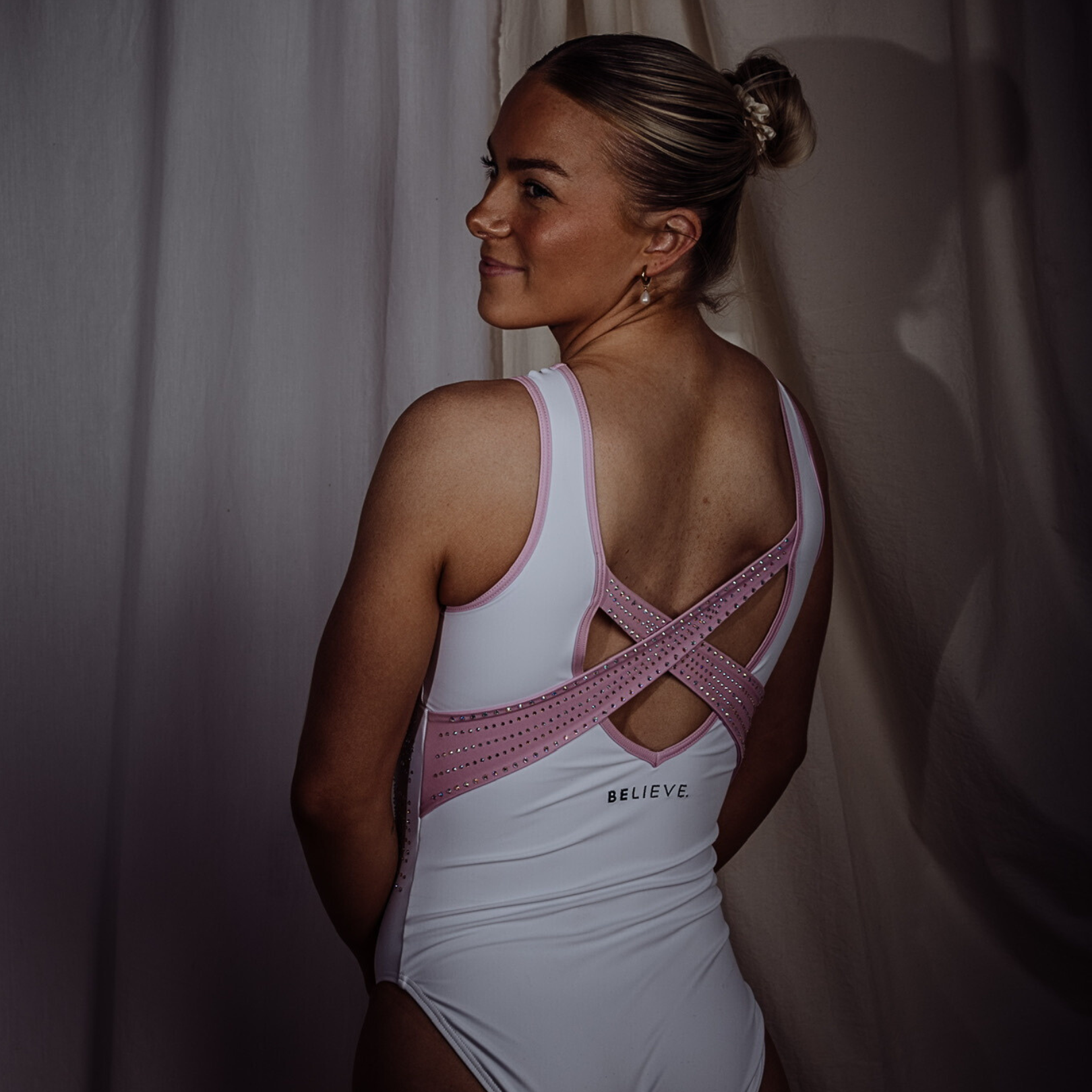 Dit prachtige turnpakje Gigi is van het merk Believe uit Engeland. Dit turnpakje is gemaakt van lycra in de kleur wit met details in lichtroze lycra. De crystal steentjes zijn in de kleur A/B en kleuren mee als je beweegt. De achterkant en voorkant zijn speciaal en voorzien van een mooi patroon en bijzondere details.