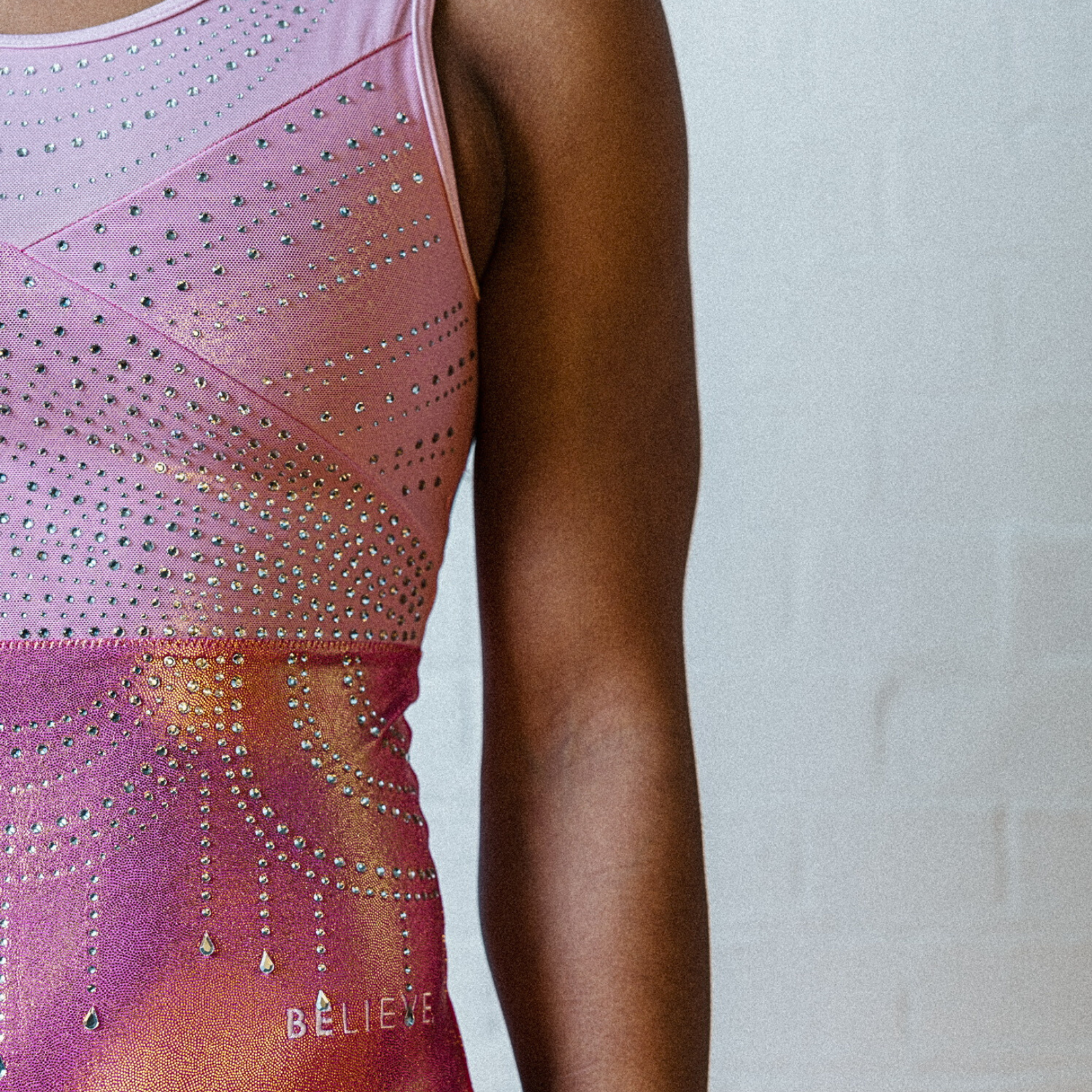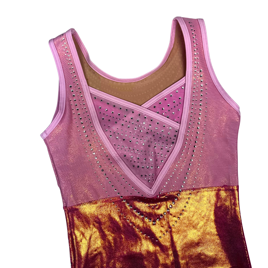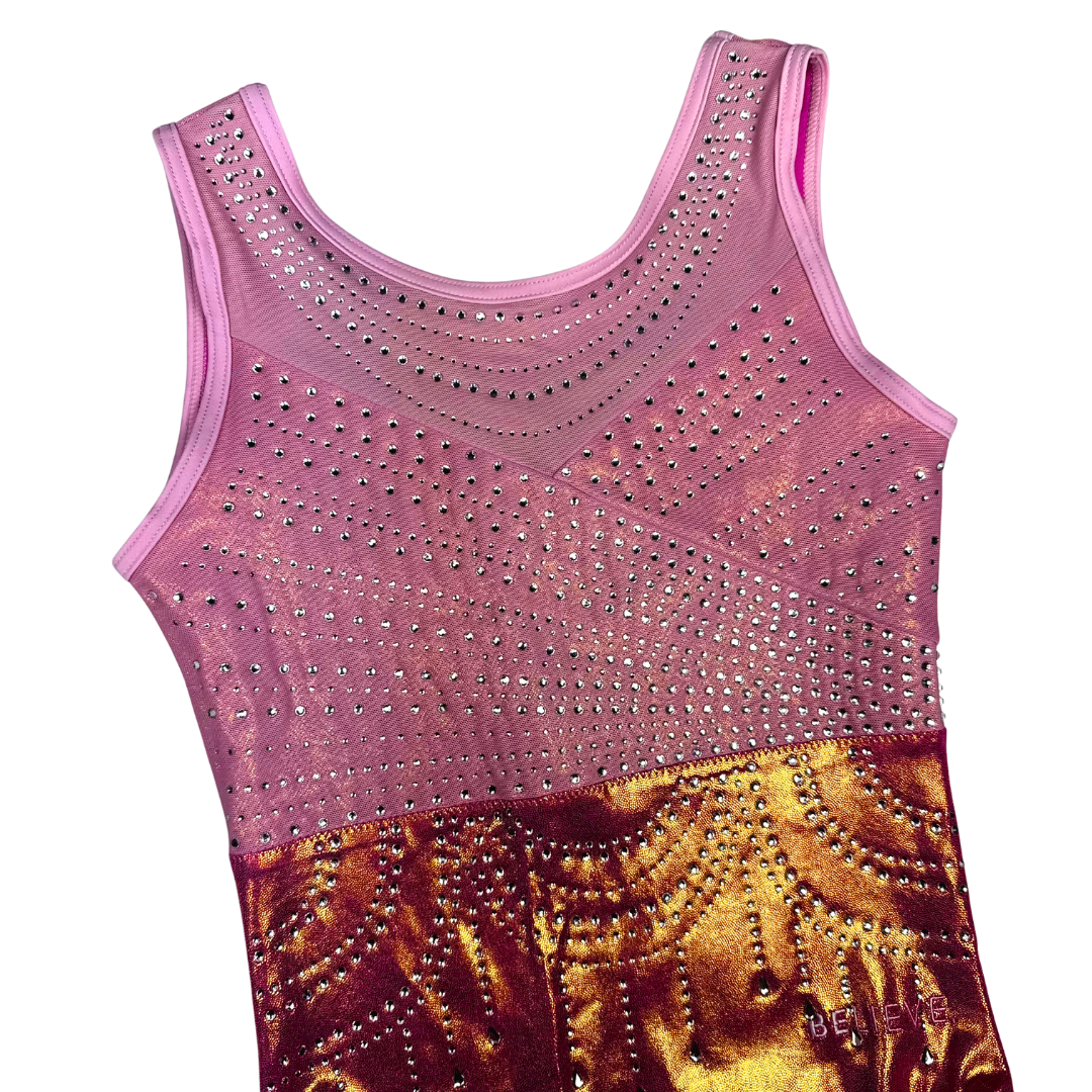 Dit prachtige turnpakje Mao is van het merk Believe uit Engeland. Dit turnpakje is gemaakt van mystic in de kleur roze, daarnaast is mesh en lycra in dezelfde tinten gebruikt. De crystal steentjes zijn in de kleur A/B en kleuren mee als je beweegt. De achterkant en voorkant zijn speciaal en voorzien van een mooi patroon en bijzondere details.