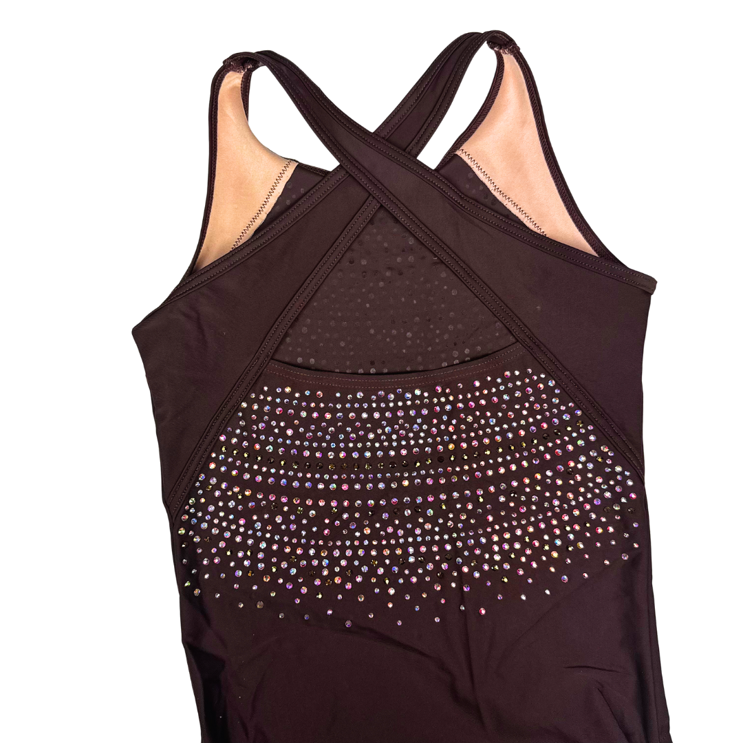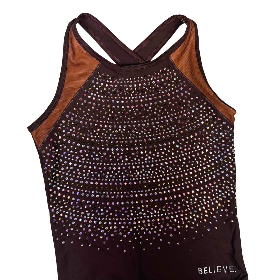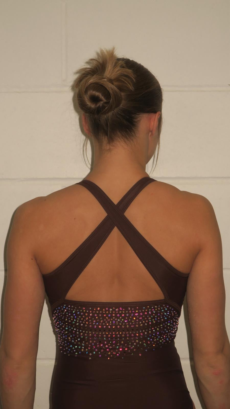 Dit prachtige turnpakje Odette is van het merk Believe uit Engeland. Dit turnpakje is gemaakt van lycra in de kleur bruin met details in een tint lichter. De crystal steentjes zijn in de kleur A/B en brons en kleuren mee als je beweegt. De achterkant en voorkant zijn speciaal en voorzien van een mooi patroon en bijzondere details.