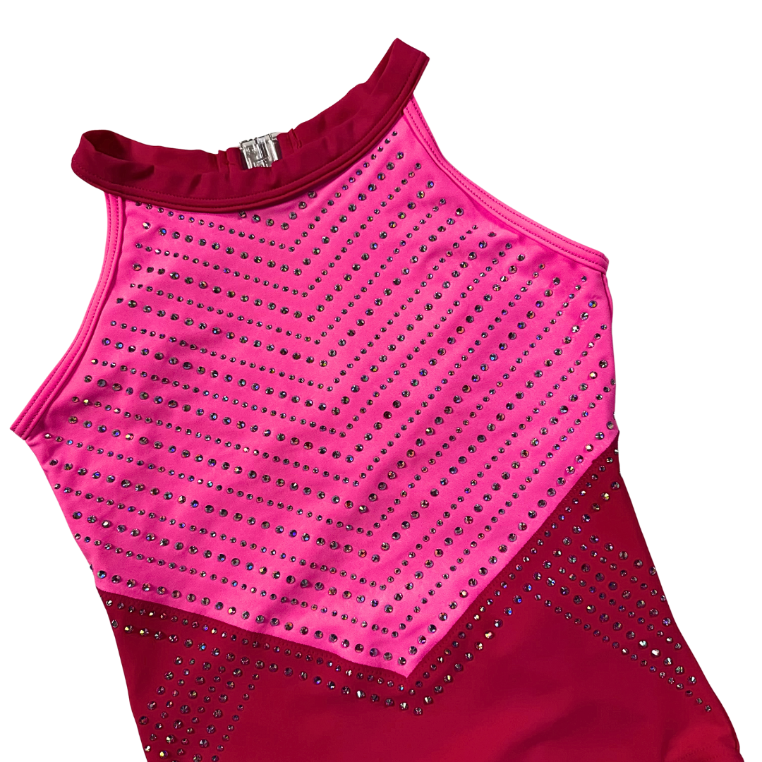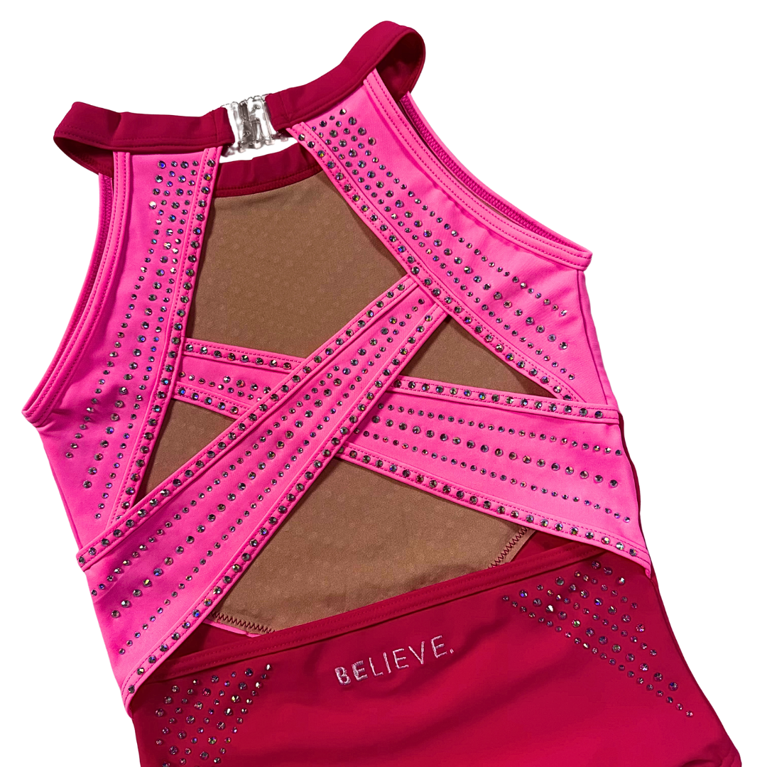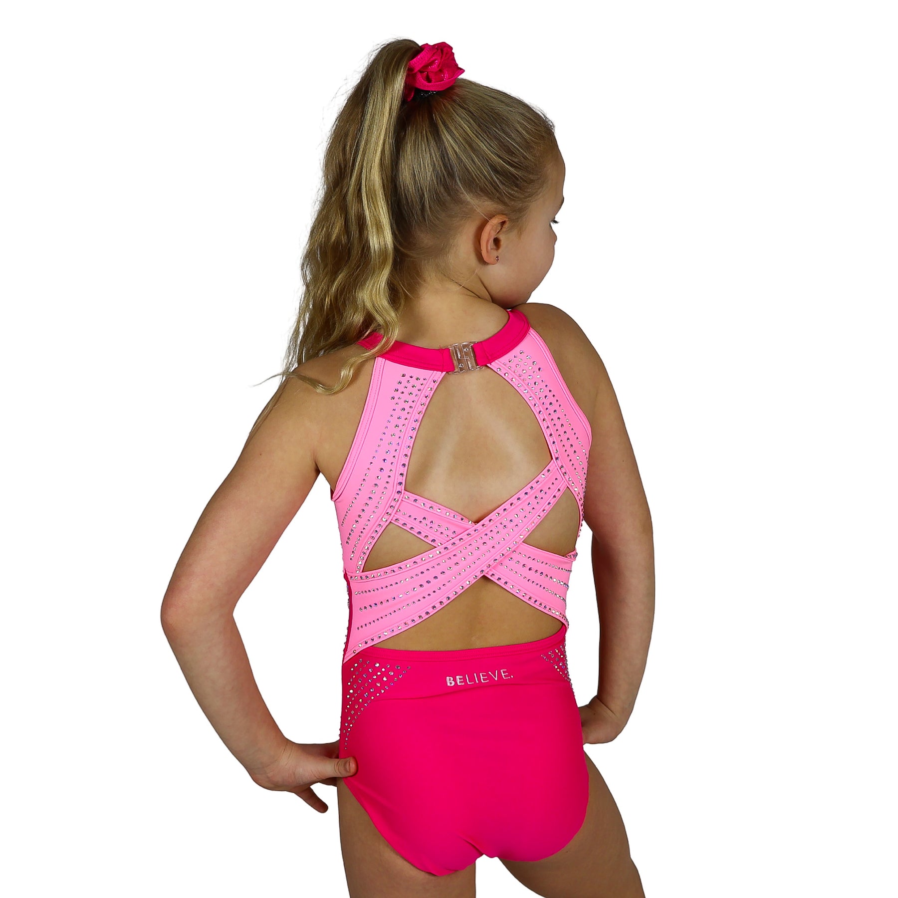 Dit prachtige turnpakje Regina is van het merk Believe uit Engeland. Dit turnpakje is gemaakt van lycra in 2 kleuren namelijk lichtroze en baby roze. De crystal steentjes zijn in de kleur A/B en kleuren mee. De achterkant en voorkant zijn speciaal en voorzien van een mooi patroon en bijzondere details.