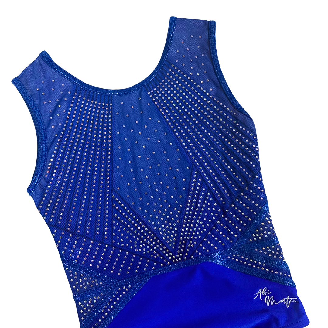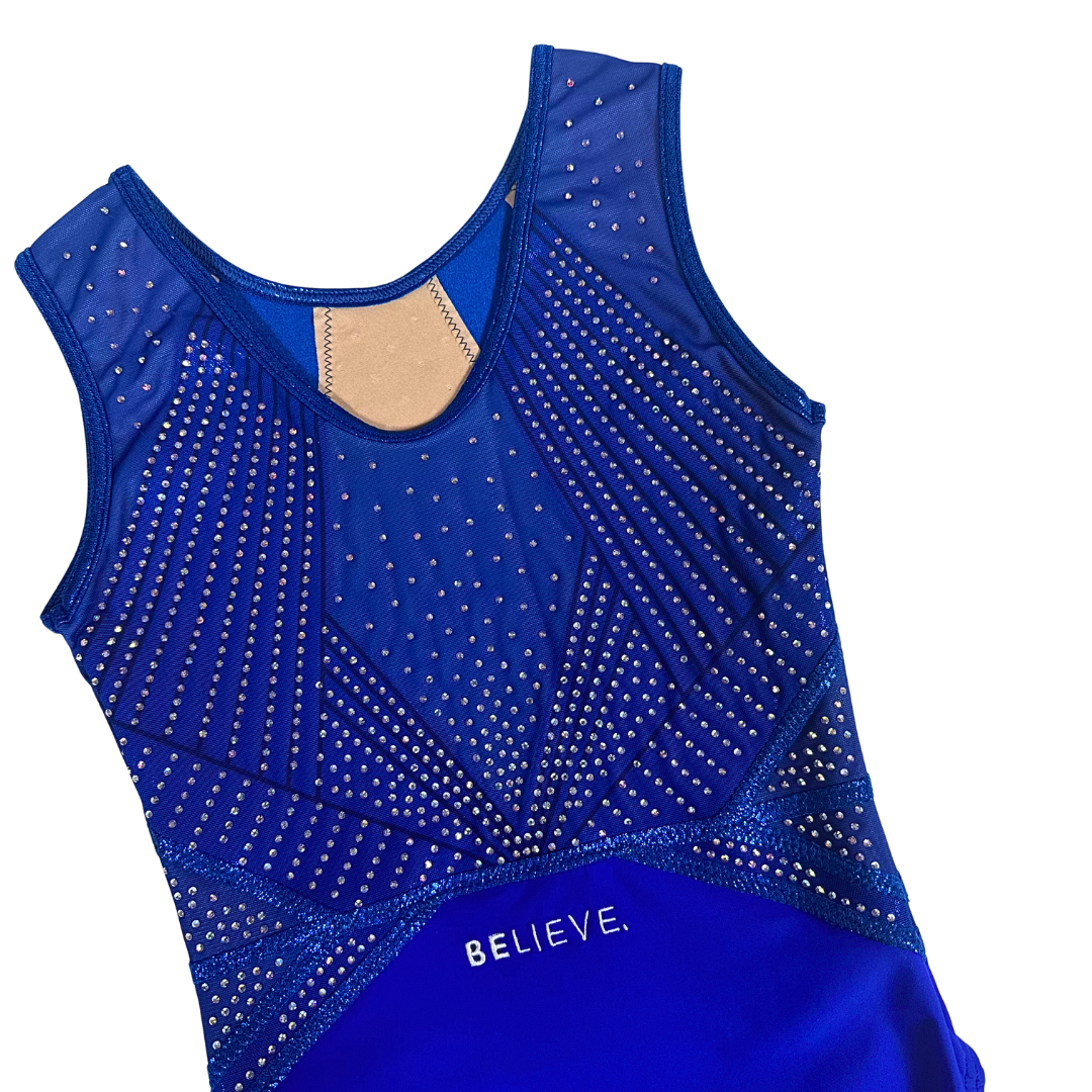 Dit prachtige turnpakje The Blue One is van het merk Believe uit Engeland. Dit turnpakje is gemaakt van royal blauw lycra met mystic blauwe details. De crystal steentjes zijn in de kleur A/B en kleuren mee als je beweegt. De achterkant en voorkant zijn speciaal en voorzien van een mooi patroon en bijzondere details.