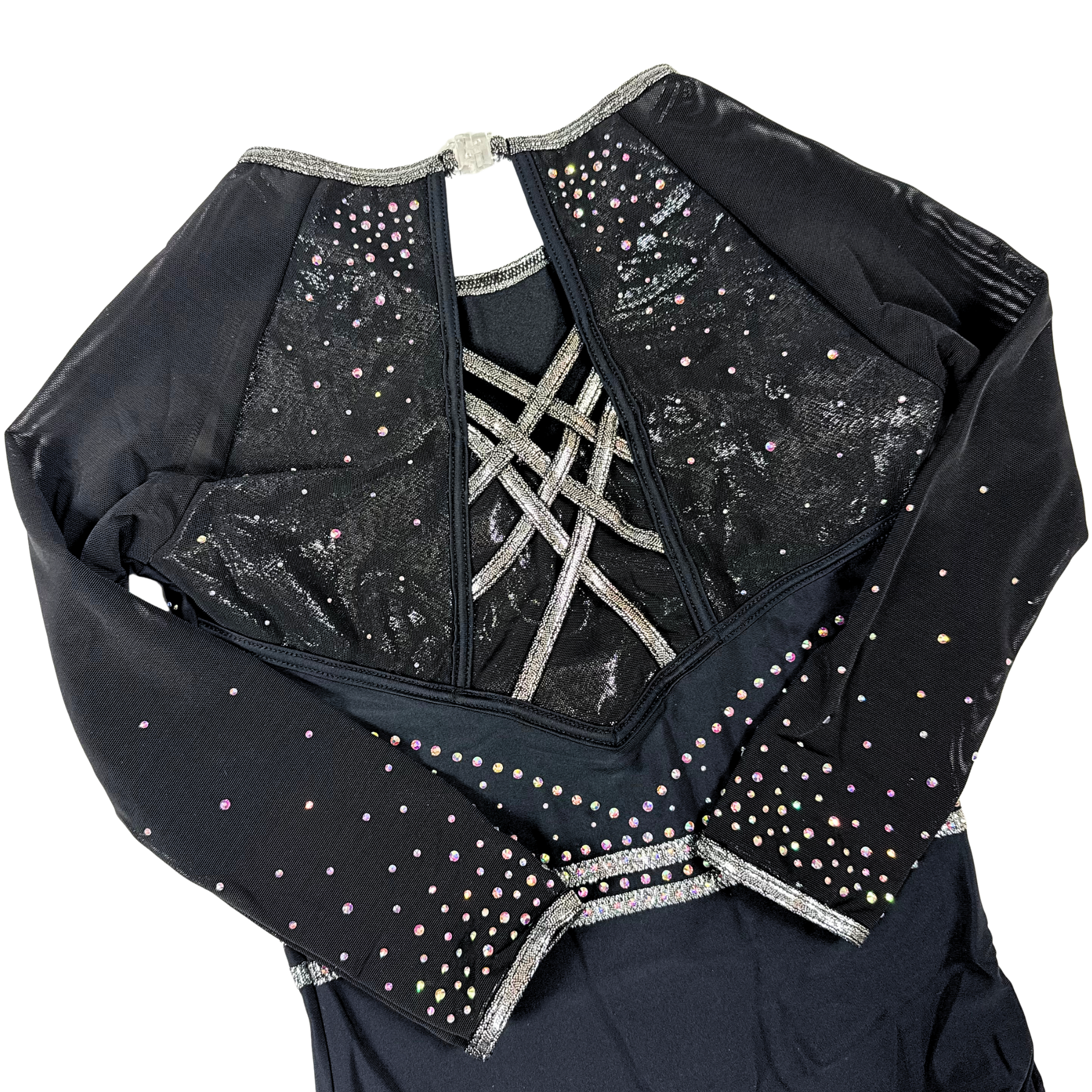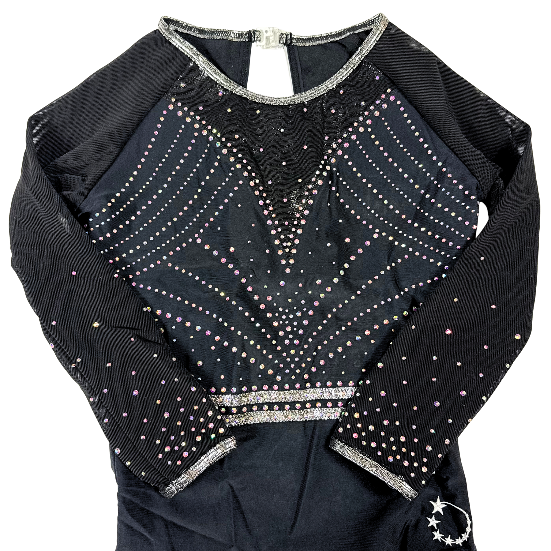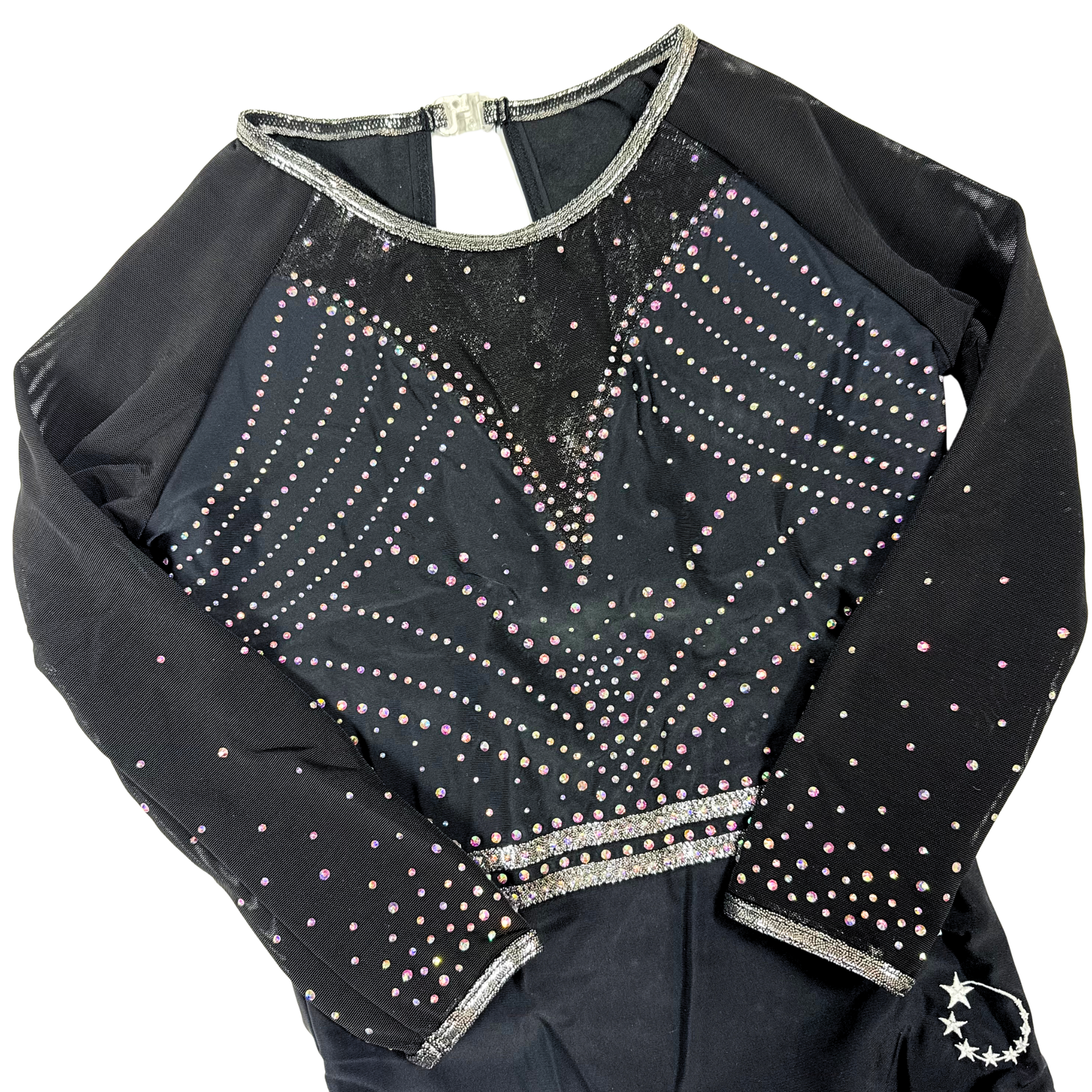 This beautiful Hotshot leotard is from the brand Little Stars Leotards from England. The leotard is made of black lycra with silver details and sparkling AB rhinestones. Both the front and back are special, featuring a beautiful pattern and unique details.