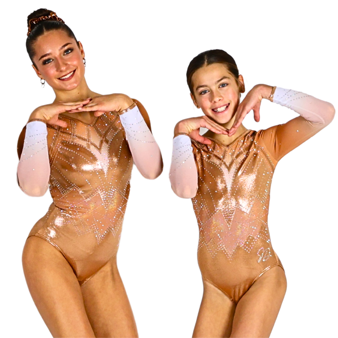 The Fenna leotard is made of champagne-colored mystic and mesh. The AB crystal stones change color as you move. Perfect for training, but also a striking competition leotard thanks to the beautiful details.