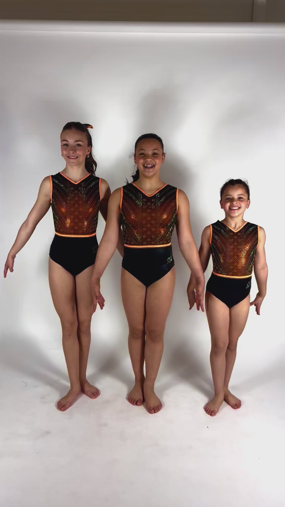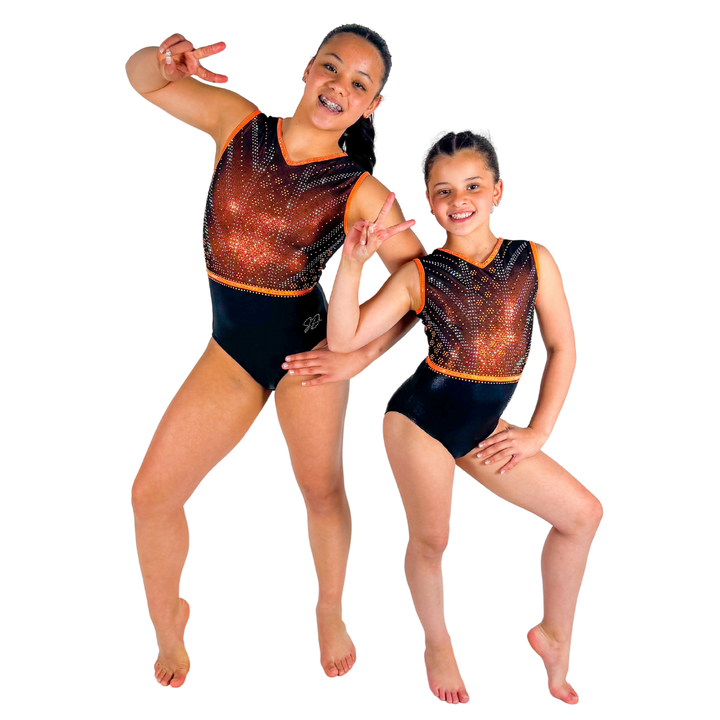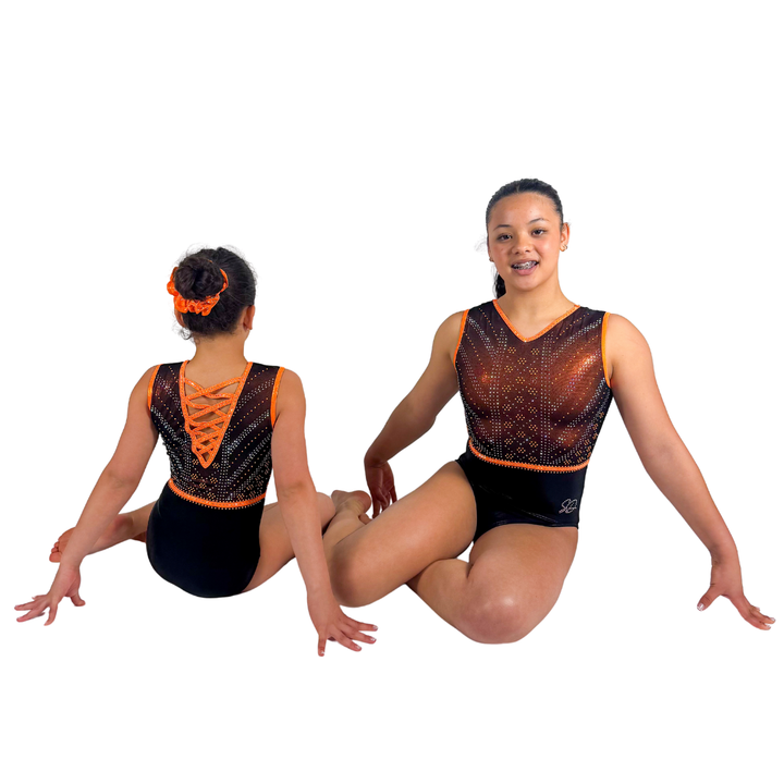 This beautiful Liz leotard from the latest special back collection is made of mystic glitter fabric in black and neon orange. The crystal stones are mixed in colors A/B and neon orange and change color as you move. The back is special and features crossed straps. The short sleeves make it ideal for training, but also perfect as a competition leotard thanks to the beautiful details and luxurious look. The Mystic Black Gymnastics Shorts and Scrunchie Black AB Stones and Scrunchie Neon Orange AB Stones and Scrunchie Black are a perfect match.