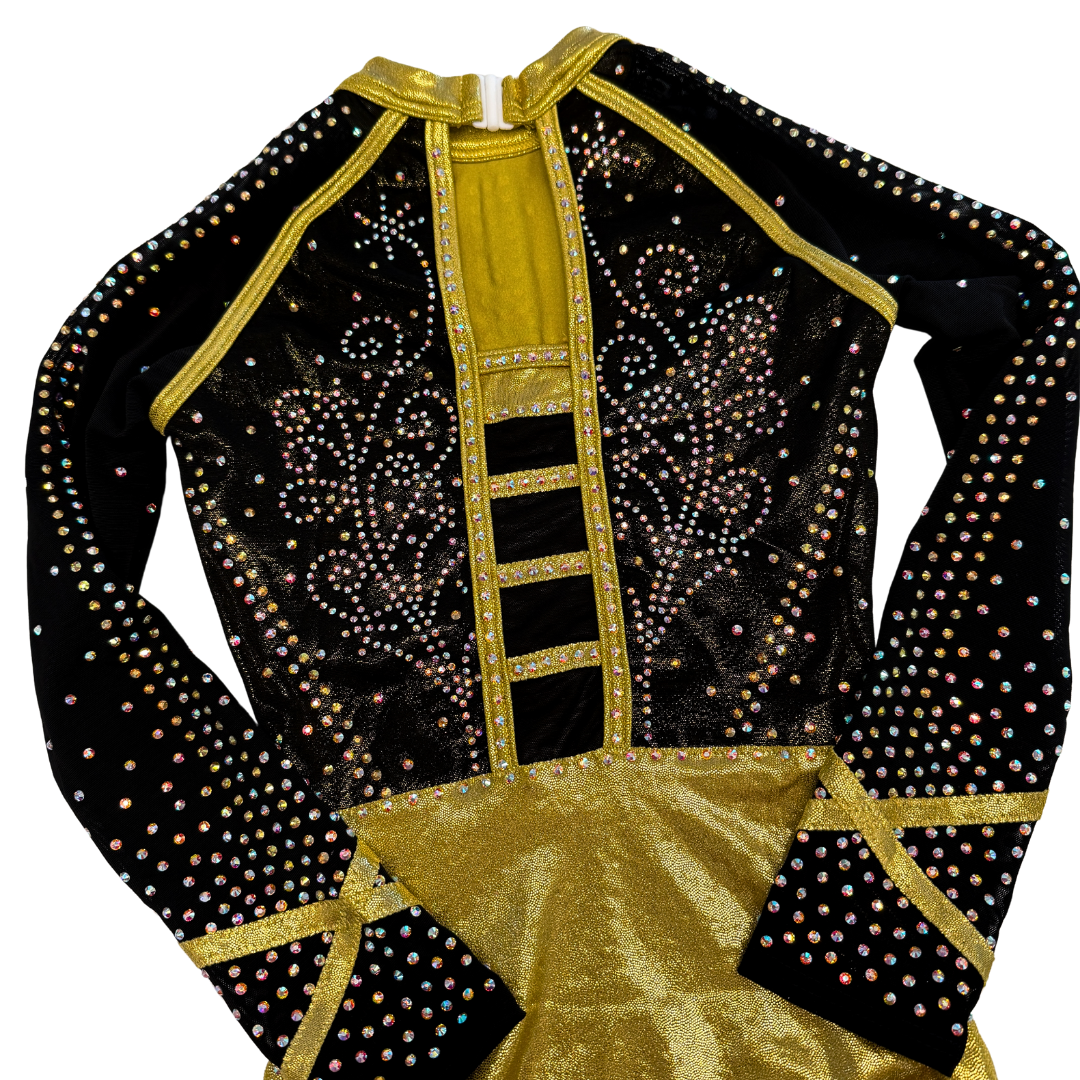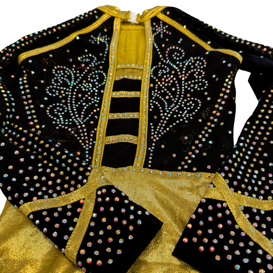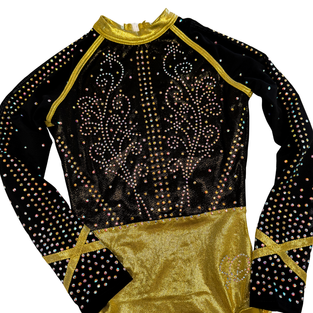 This exclusive Tara leotard from our limited edition collection is our newest addition. It's crafted from gold and black mystic. The beautifully shaped crystal stones are in the colors A/B and gold, and they complement each other. The back is unique and features a beautiful pattern with a unique mesh back. This style is ideal as a competition leotard or for training, but also perfect for wearing as a club leotard thanks to its beautiful details and luxurious look. The gold scrunchie with A/B stones is a color match.