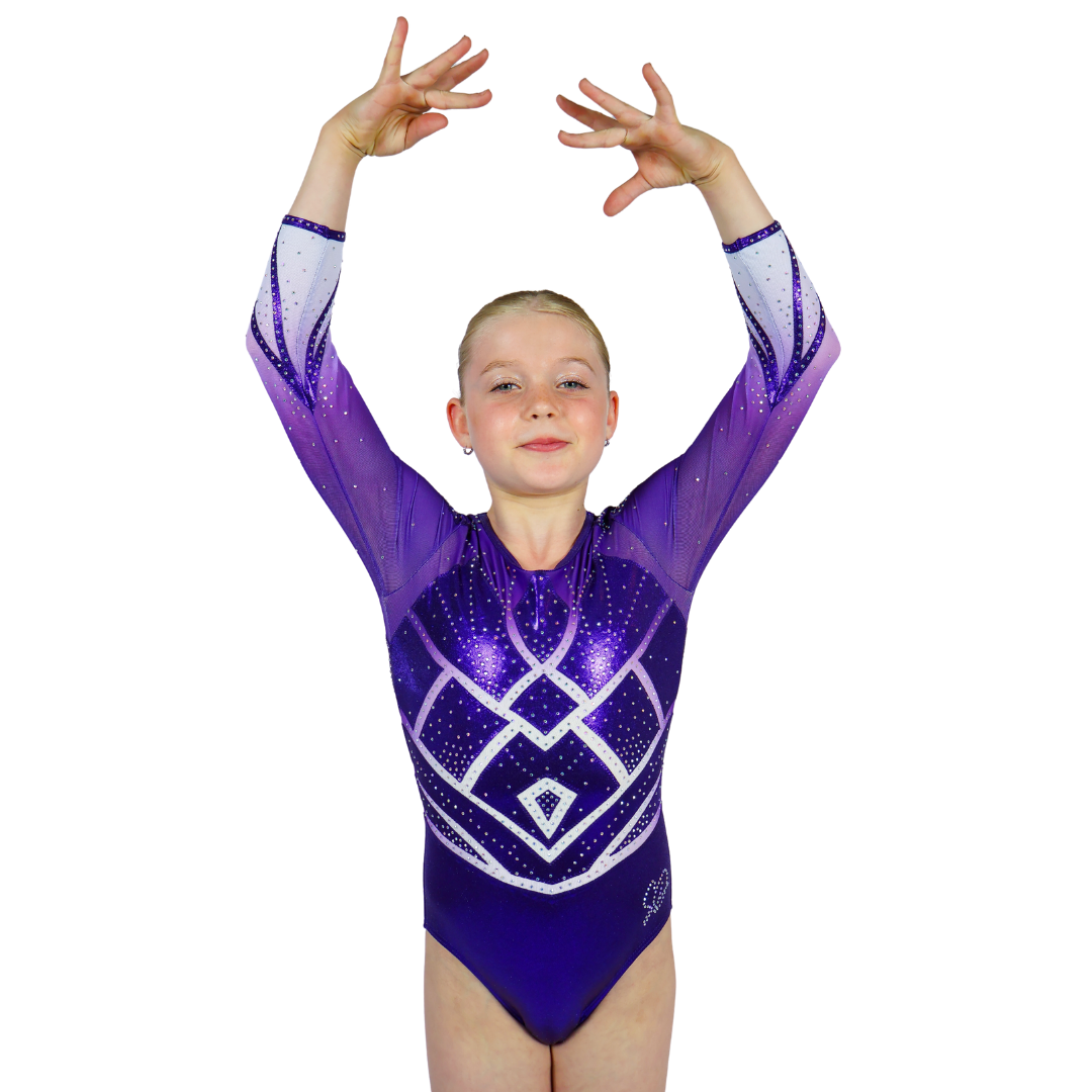 Ceci est une édition limitée spécialement conçue pour les finales ! Ce justaucorps exclusif Nova à manches longues et très confortable est fabriqué en tissu mystic pailleté de couleur violette. Les manches et le reste du justaucorps sont en maille dégradée du violet au blanc. Les strass en cristal sont de couleur AB et changent de couleur lorsque vous bougez. Le dos spécial complète parfaitement ce justaucorps ! Un attrape-regard parfait pour briller lors des compétitions !