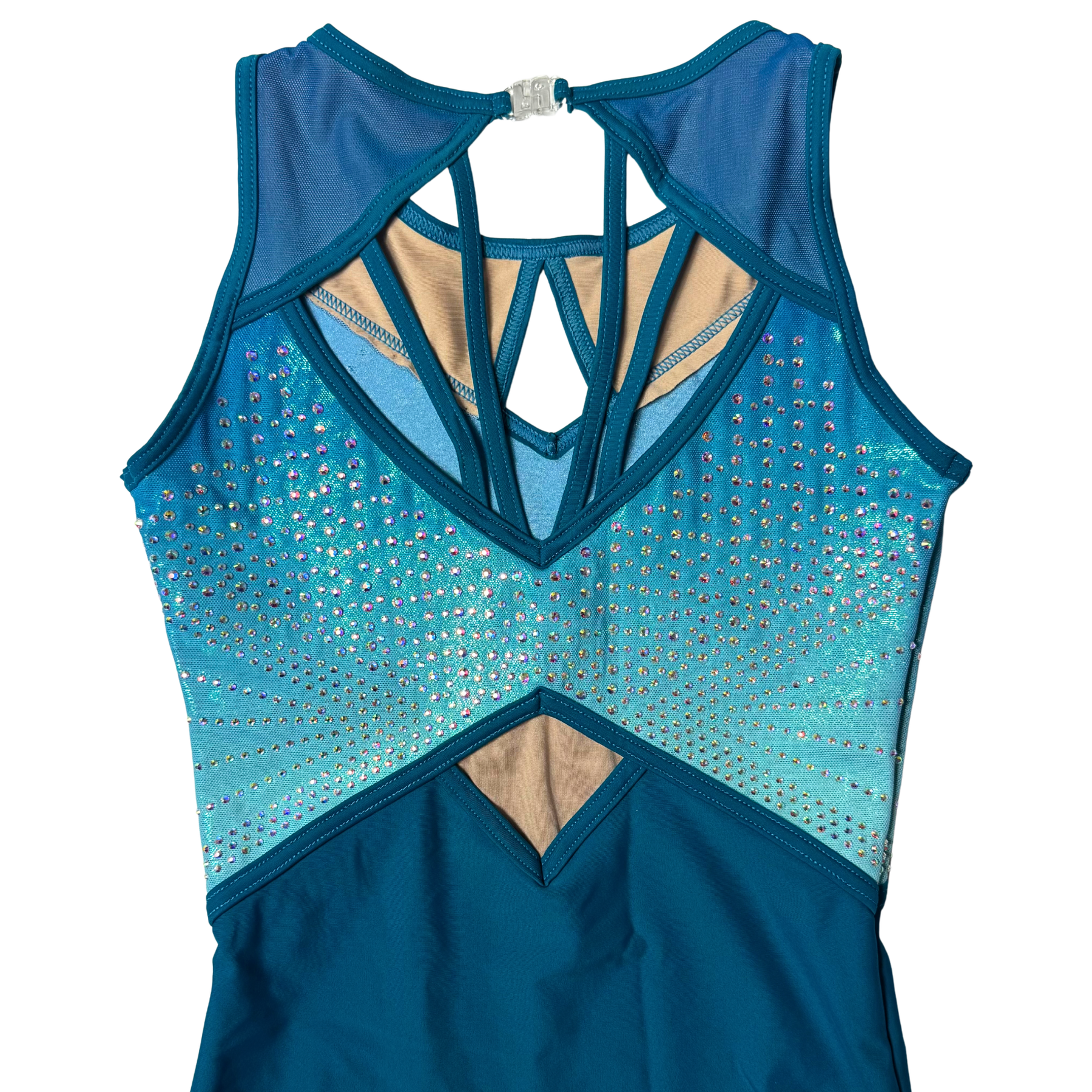 Ce magnifique justaucorps Krystal est signé Little Stars Leotards, une marque anglaise. Confectionné en lycra bleu avec des empiècements en résille et des strass AB scintillants, il présente un motif unique à l'avant comme à l'arrière.