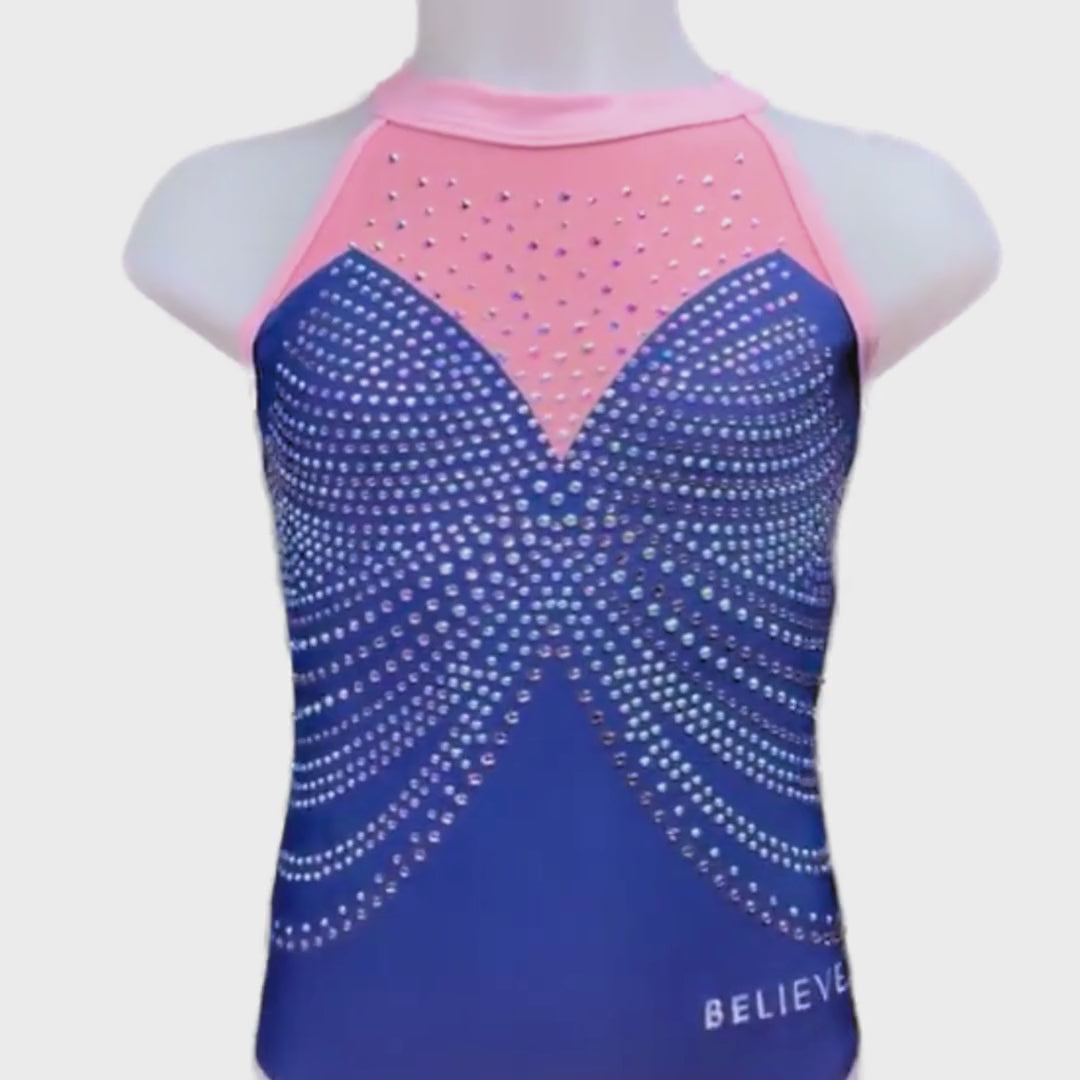 Ce magnifique justaucorps Daniella est de la marque anglaise Believe. Ce justaucorps est fabriqué en lycra bleu foncé et rose clair, et est orné de détails en maille, ce qui lui donne un effet luxueux. Les strass en cristal sont de couleur A/B et changent de couleur lorsque vous bougez ; des strass rose clair sont également incorporés dans ce justaucorps. Le dos et le devant sont spéciaux et présentent un joli motif et des détails particuliers.