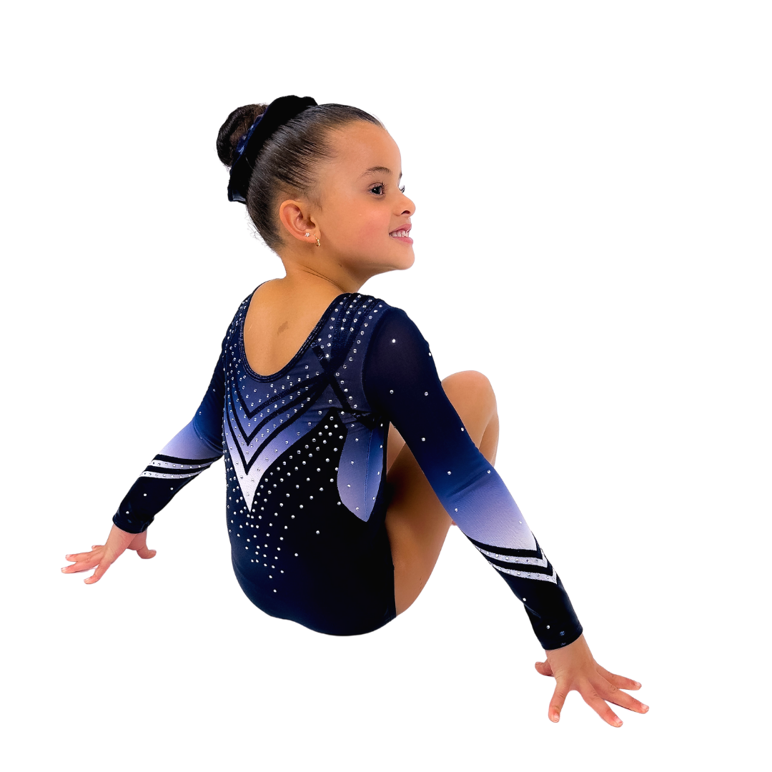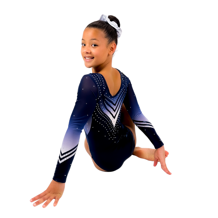 Dit exclusieve lekker zittende turnpakje Elise met lange mouwen is met recht één van onze bestsellers. Het turnpakje is gemaakt van mystic glitter stof in de kleur navy blauw. De mouwen en de rest van het turnpakje zijn gemaakt van gaas in de kleuren navy blauw naar wit ombre. Het lijfje is voorzien van een nude kleurige onderlaag waardoor het turnpakje niet doorschijnt. De crystal steentjes zijn in de kleur zilver. Door de lange mouwen ideaal voor wedstrijden, maar ook perfect te dragen tijdens een training.