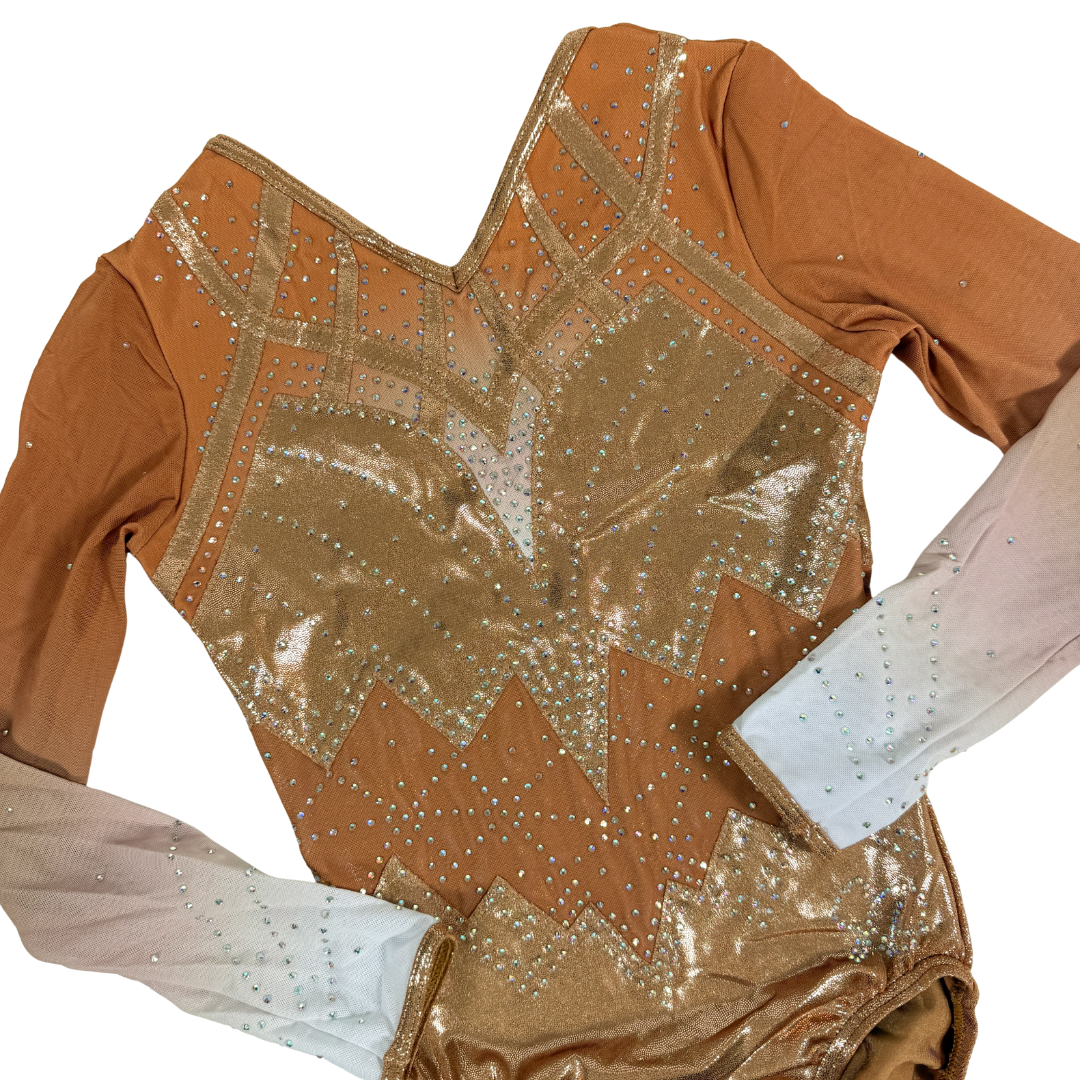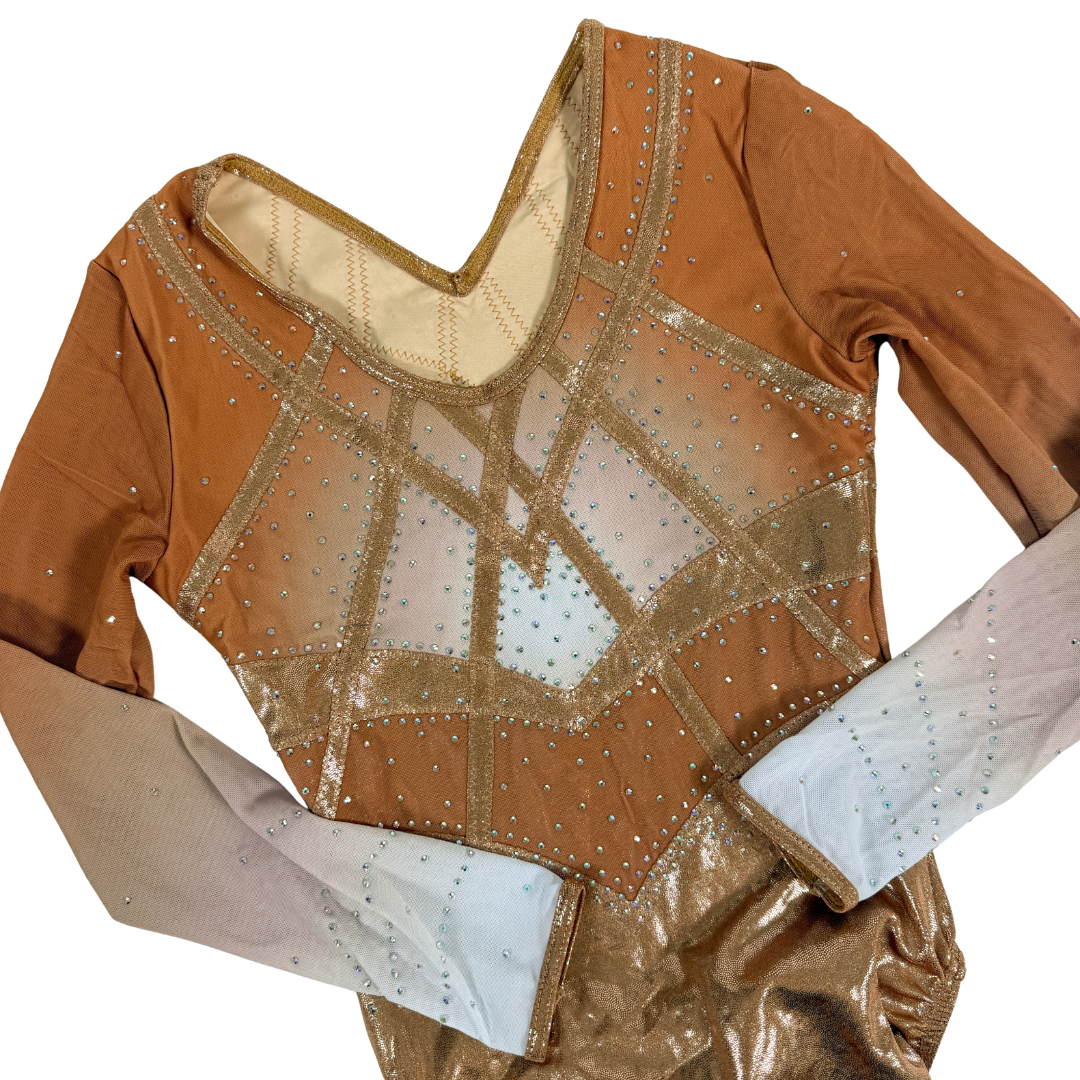 Turnpakje Fenna is gemaakt van mystic en gaas in de kleur champagne. De crystal steentjes zijn in de kleur AB en kleuren mee als je beweegt. Perfect om in te trainen, maar ook een eyecatcher als wedstrijdpakje door de prachtige details.
