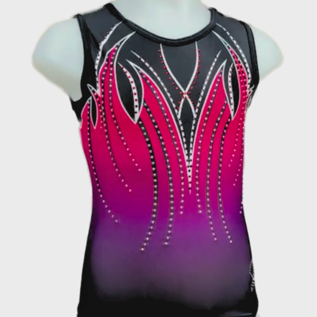 Dit prachtige mouwloze turnpakje Milou is gemaakt van enkel geprint lycra stof in de kleuren zwart, rood en paars. De crystal steentjes zijn in de kleur A/B en kleuren mee als je beweegt, daarnaast zitten er ook rode en paarse crystal steentjes in verwerkt. Door de korte mouwen ideaal om mee te trainen, maar ook perfect te dragen als wedstrijdpakje door de mooie details.