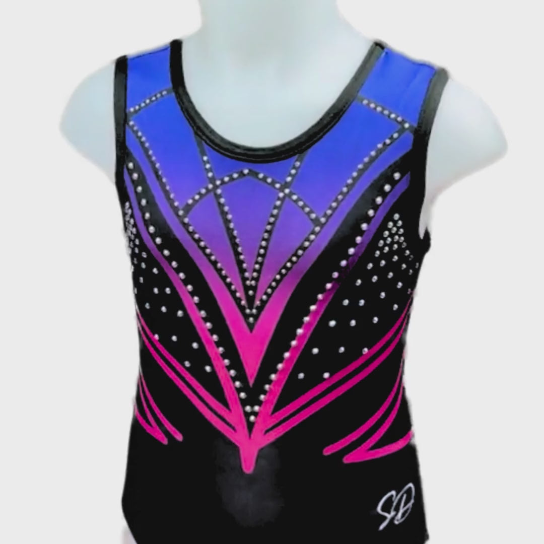 Dit mooie mouwloze turnpakje Sam is populair in onze collectie. Het pakje is gemaakt van dubbel gevoerde lycra stof in de kleur zwart met geprinte lijnen in de overlopende kleuren van roze naar paars naar blauw. De crystal details zijn in de kleur AB en kleuren mee. Door de korte mouwen ideaal om mee te trainen, maar ook perfect te dragen als wedstrijdpakje door de mooie details.