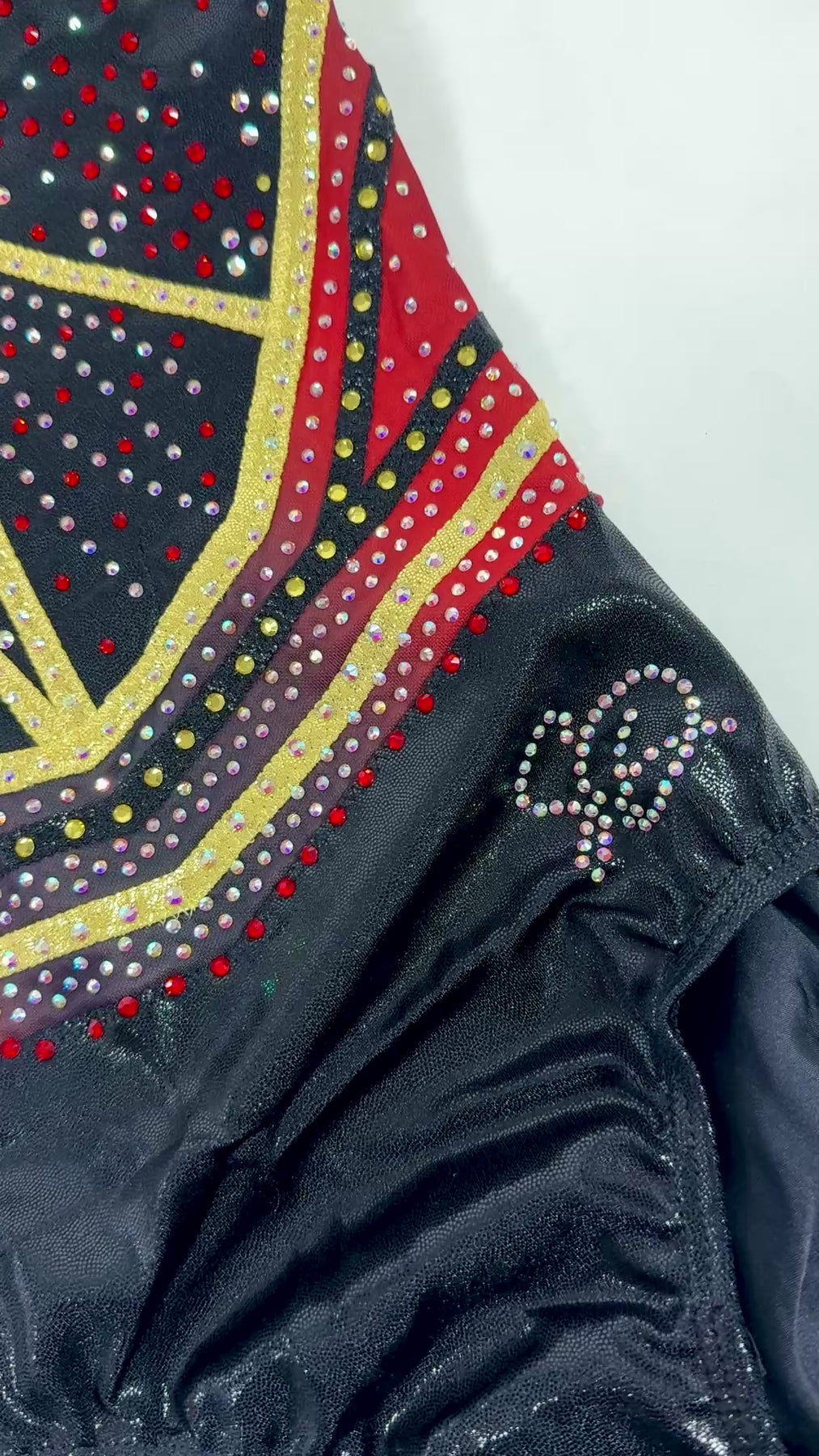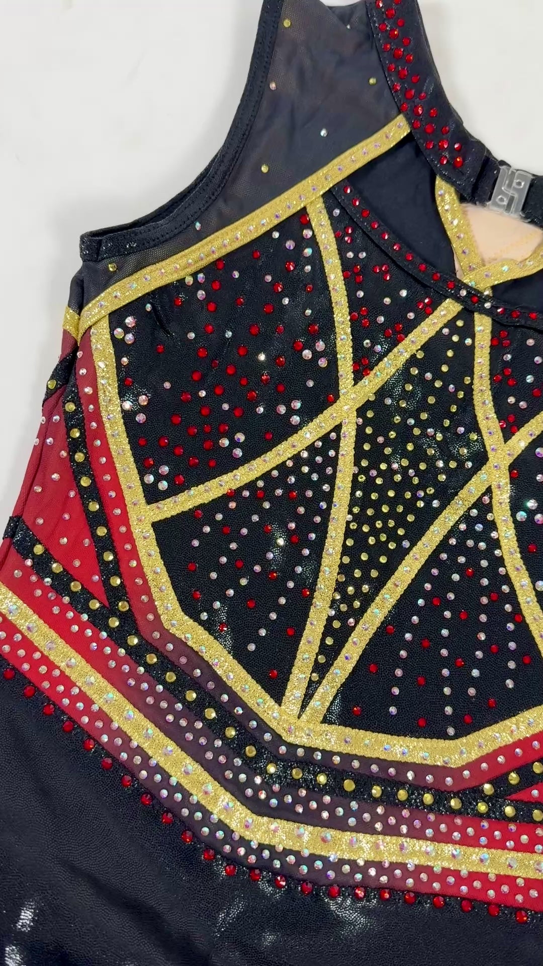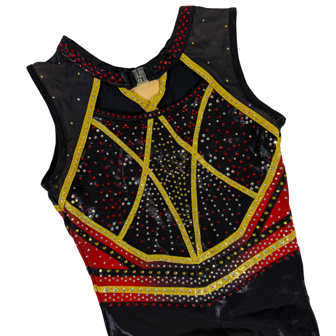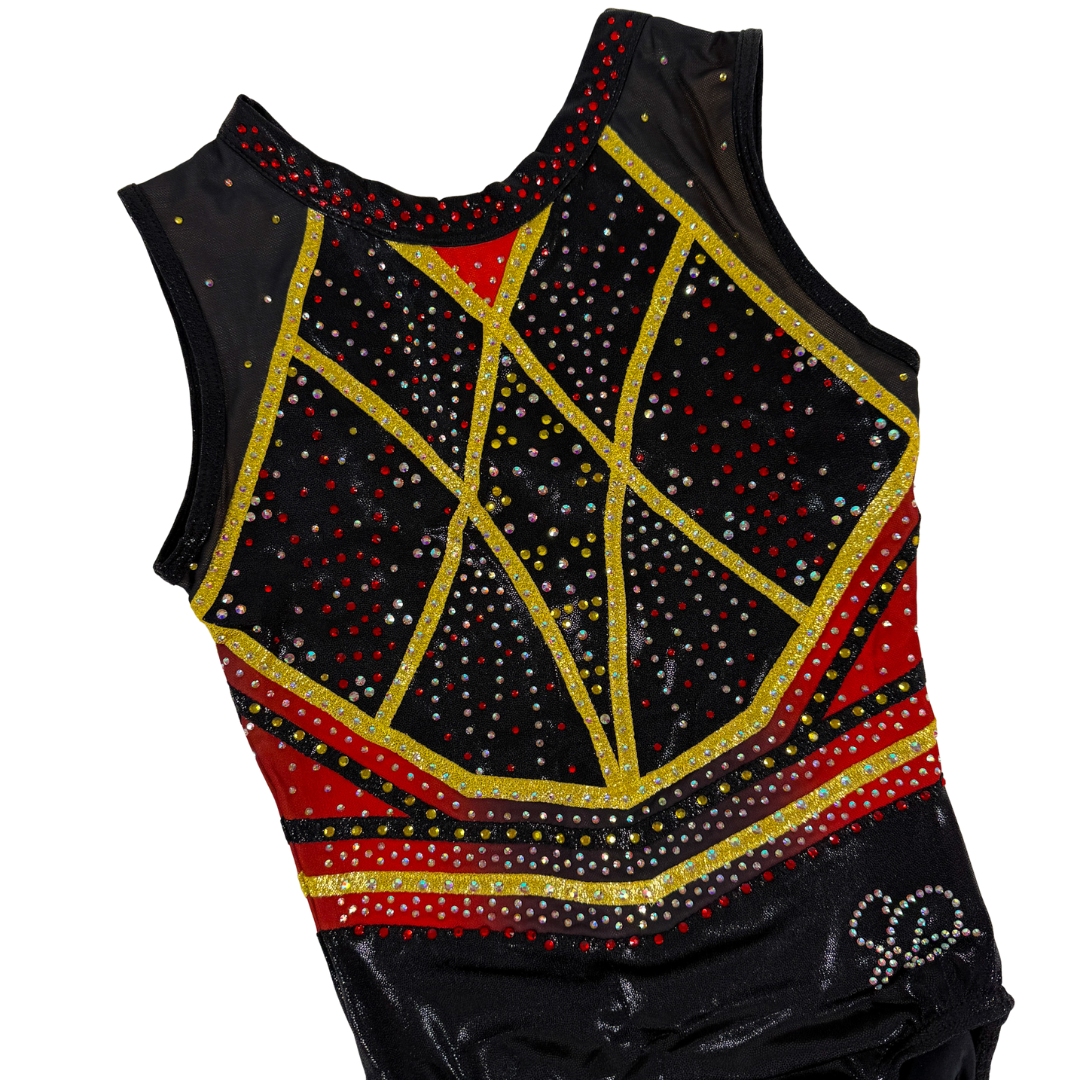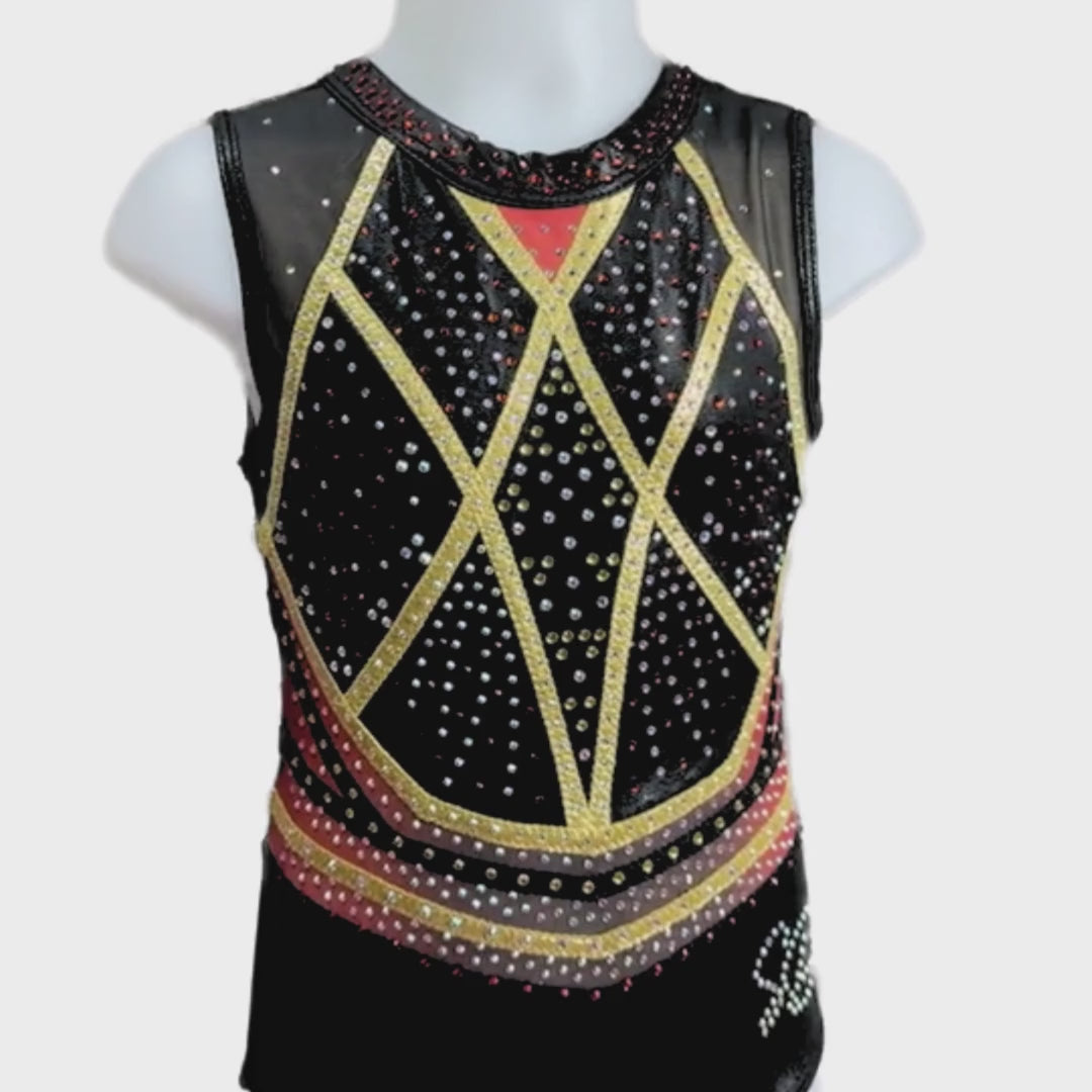 Turnpakje Sienna is gemaakt van zwart en goud mystic en gaas in de kleur zwart met een overloop naar rood. De crystal steentjes zijn in de kleur rood, goud en AB en kleuren mee als je beweegt. Perfect om in te trainen, maar ook een eyecatcher als wedstrijdpakje door de prachtige details.