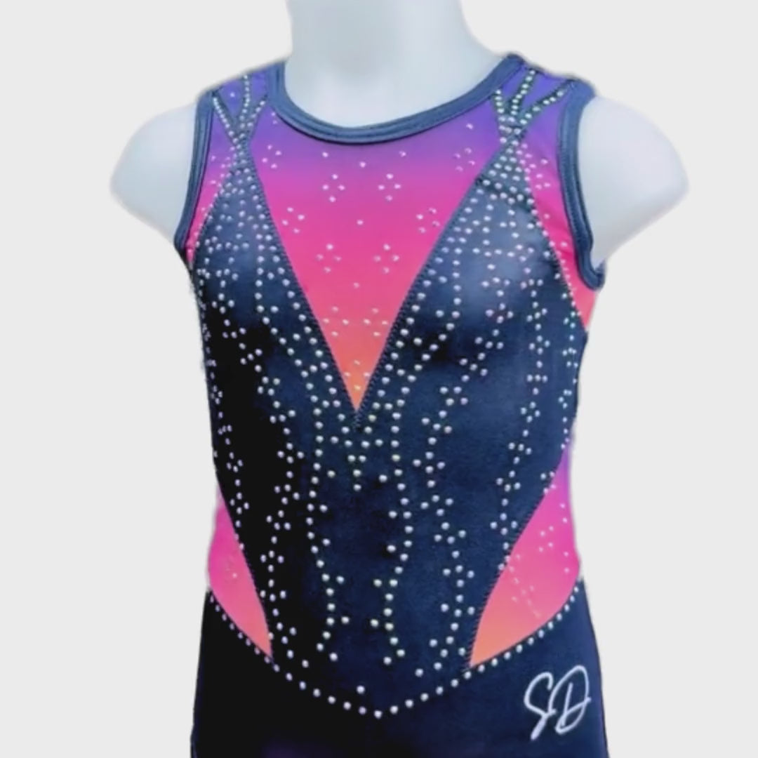 Turnpakje Vive is gemaakt van mystic in de kleur navy blauw met een kleur verloop van zalmroze naar roze naar navy blauw ombre aan de bovenkant en zijkant. De crystal steentjes zijn in de kleur AB en kleuren mee als je beweegt. Perfect om in te trainen, maar ook een eyecatcher als wedstrijdpakje door de prachtige details.