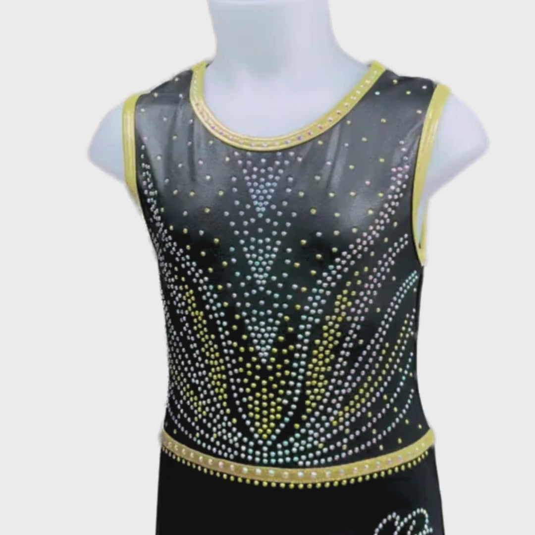 Dit prachtige turnpakje Zenna uit de nieuwste speciale rug collectie is gemaakt van mystic glitter stof in de kleuren zwart en goud. De crystal steentjes zijn in de kleur A/B en goud gemixt en kleuren mee als je beweegt. De achterkant is speciaal en voorzien van gekruiste bandjes. Door de korte mouwen ideaal om mee te trainen, maar ook perfect te dragen als wedstrijdpakje door de mooie details en luxe uitstraling.