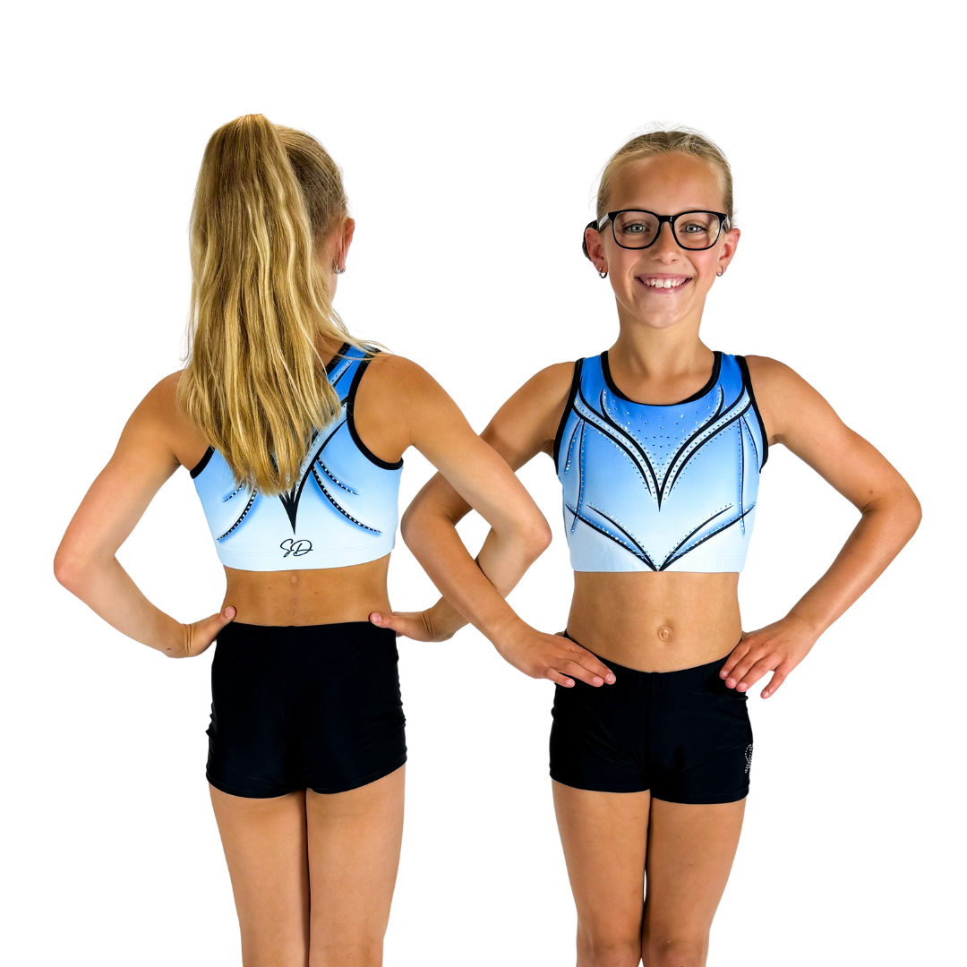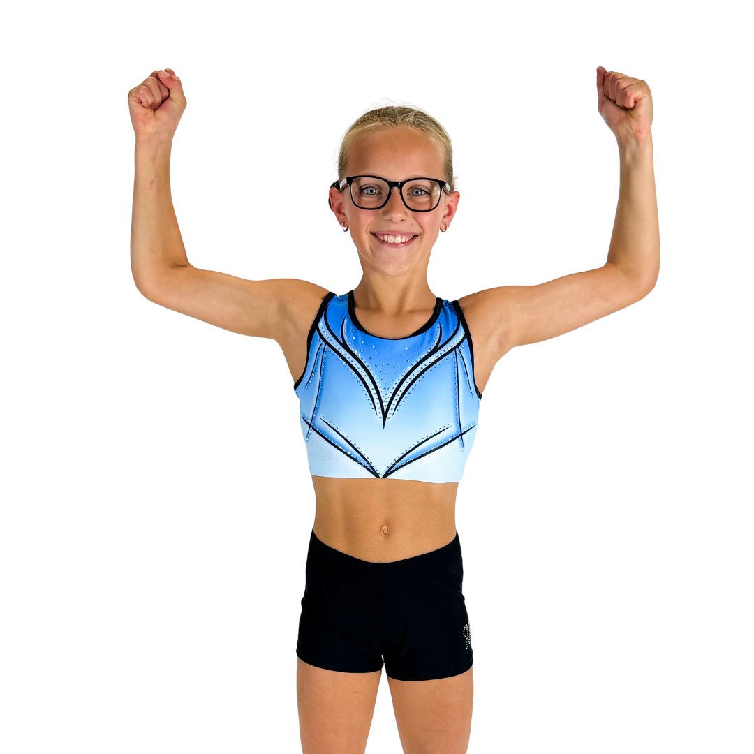 Dit prachtige heerlijk zittende turntopje is enkel gevoerd en gemaakt van lycra geprinte stof in de kleuren blauw en zwart en overlopend naar lichtblauw wit ombre. Deze sporttop heeft luxe A/B crystal steentjes die meekleuren als je beweegt. Ideaal om mee te trainen tijdens de warme zomermaanden maar ook in een warme turnhal of gewoon thuis.